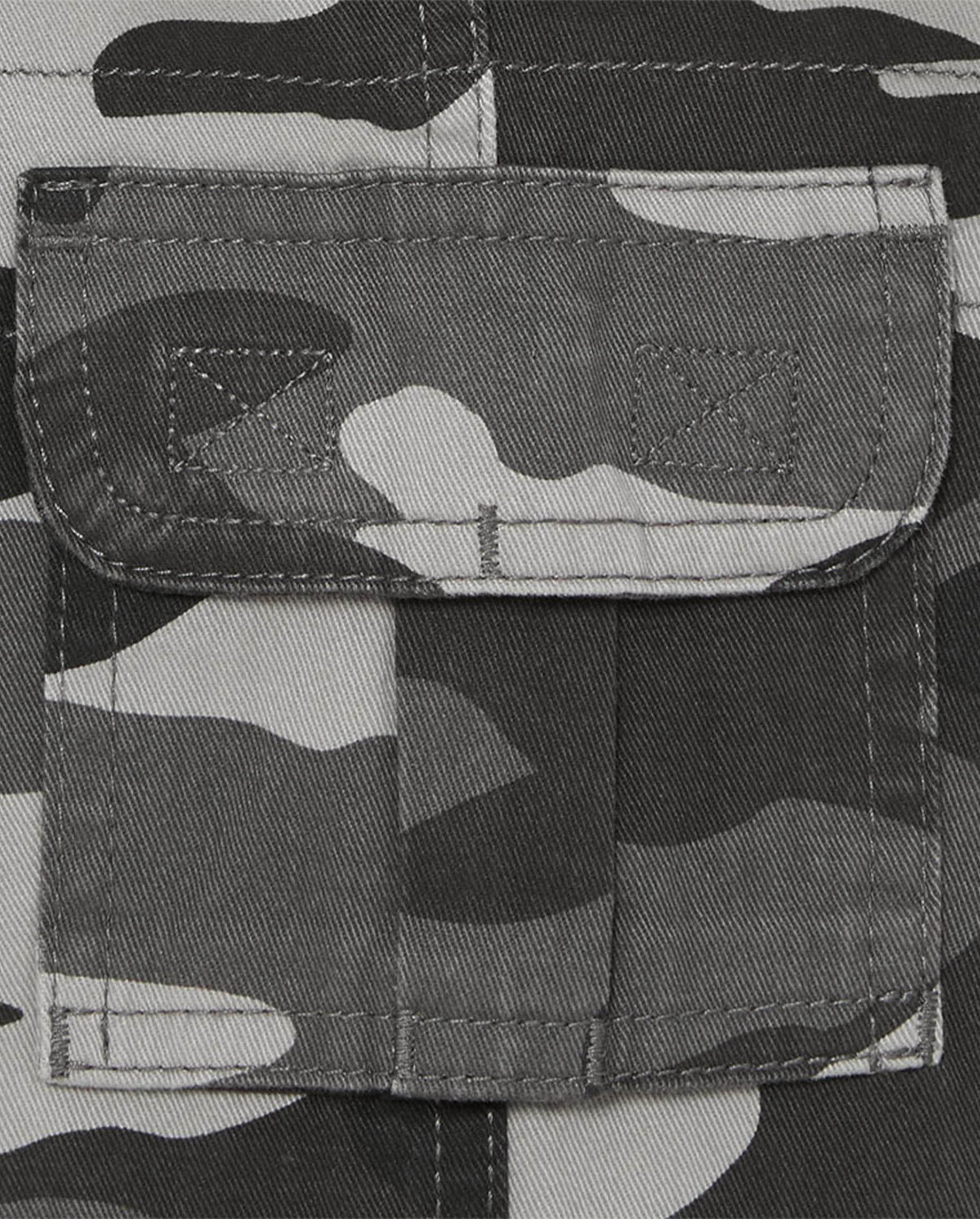 Styled with side slant and cargo-flap pockets; back patch pocket