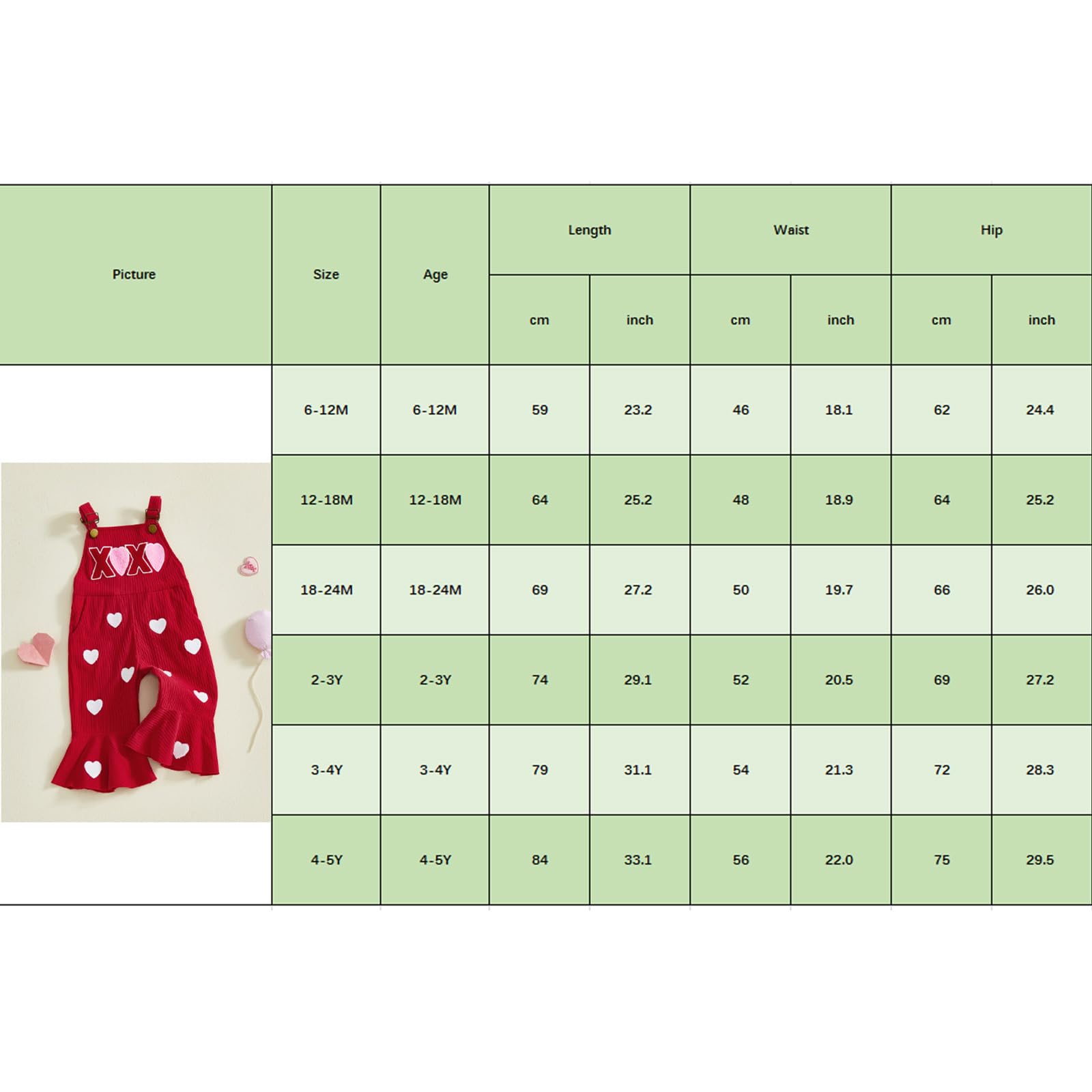 Description Toddler Baby Girl Valentiens Outfit Love Heart Romper Long Flared Jumpsuit Valentines Day Overalls 0-7 Years Old Our girls' overalls are an excellent present for your daughter or niece on Valentine's Day. Size Chart Size (cm): 90 Length: 58 Bust: 62 Waist: 44 Advised Age: 12-18 Months 100 Length: 63 Bust: 66 Waist: 46 Advised Age: 18-24 Months 110 Length: 68 Bust: 69 Waist: 48 Advised Age: 2-3 Years 120 Length: 73.5 Bust: 72 Waist: 50 Advised Age: 3-4 Years 130 Length: 79 Bust: 75 Waist: 52 Advised Age: 4-5 Years Size (inch): 90 Length: 22.83 Bust: 24.41 Waist: 17.32 Advised Age: 12-18 Months 100 Length: 24.80 Bust: 25.98 Waist: 18.11 Advised Age: 18-24 Months 110 Length: 26.77 Bust: 27.17 Waist: 18.90 Advised Age: 2-3 Years 120 Length: 28.94 Bust: 28.35 Waist: 19.69 Advised Age: 3-4 Years 130 Length: 31.10 Bust: 29.53 Waist: 20.47 Advised Age: 4-5 Years Specification Color: Red Material: 95% Cotton, 5% Polyester Pattern: Plaid Size: 90, 100, 110, 120, 130 Package Contents 1 pair of overalls Friendly Tips 1.Please kindly allow 2-3% difference according to manual measurement 2.Please check the measurement chart carefully before you buy the item. (1 inch=2.54cm) 3.Please note that a slight color difference should be acceptable due to the light and screen. Thanks.