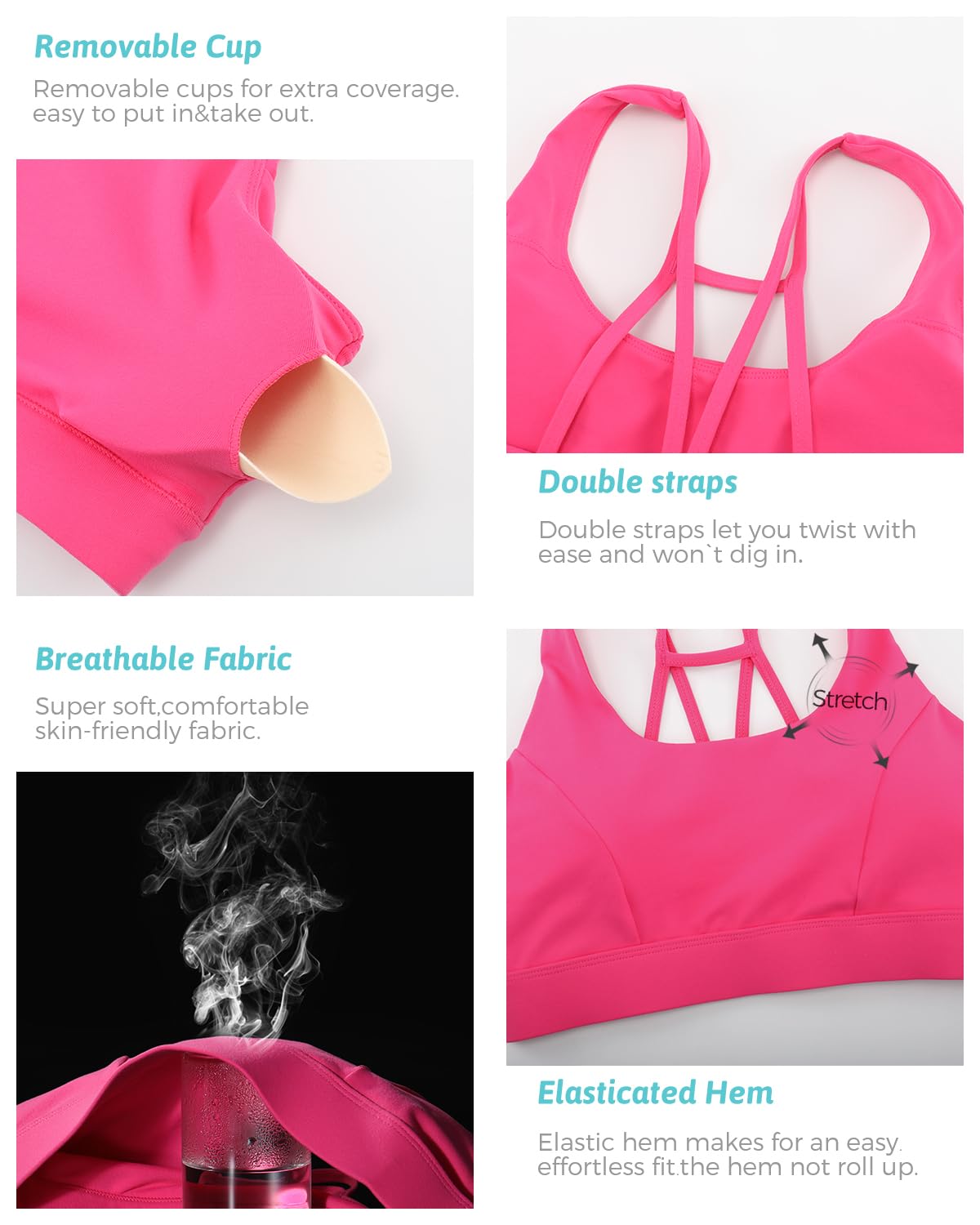 √YOUR SECURE FIT - Strappy design meets sporty style. Super soft scoop neckline with light, removable pads. Open cutout back styling sports bras for women medium support, widen band underneath the breast ensures a tight secure fit. Removable cups for extra coverage. The removable vertical cotton bra pads are easy to clean.The padded sports bra which always retains its shape and prevent bra bulges, caresses your figure to adjust to your curves.