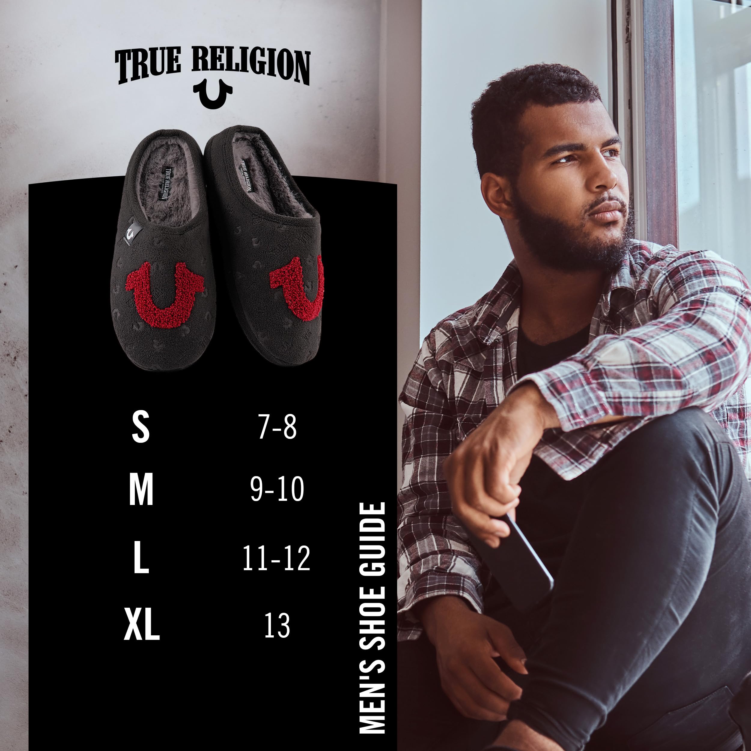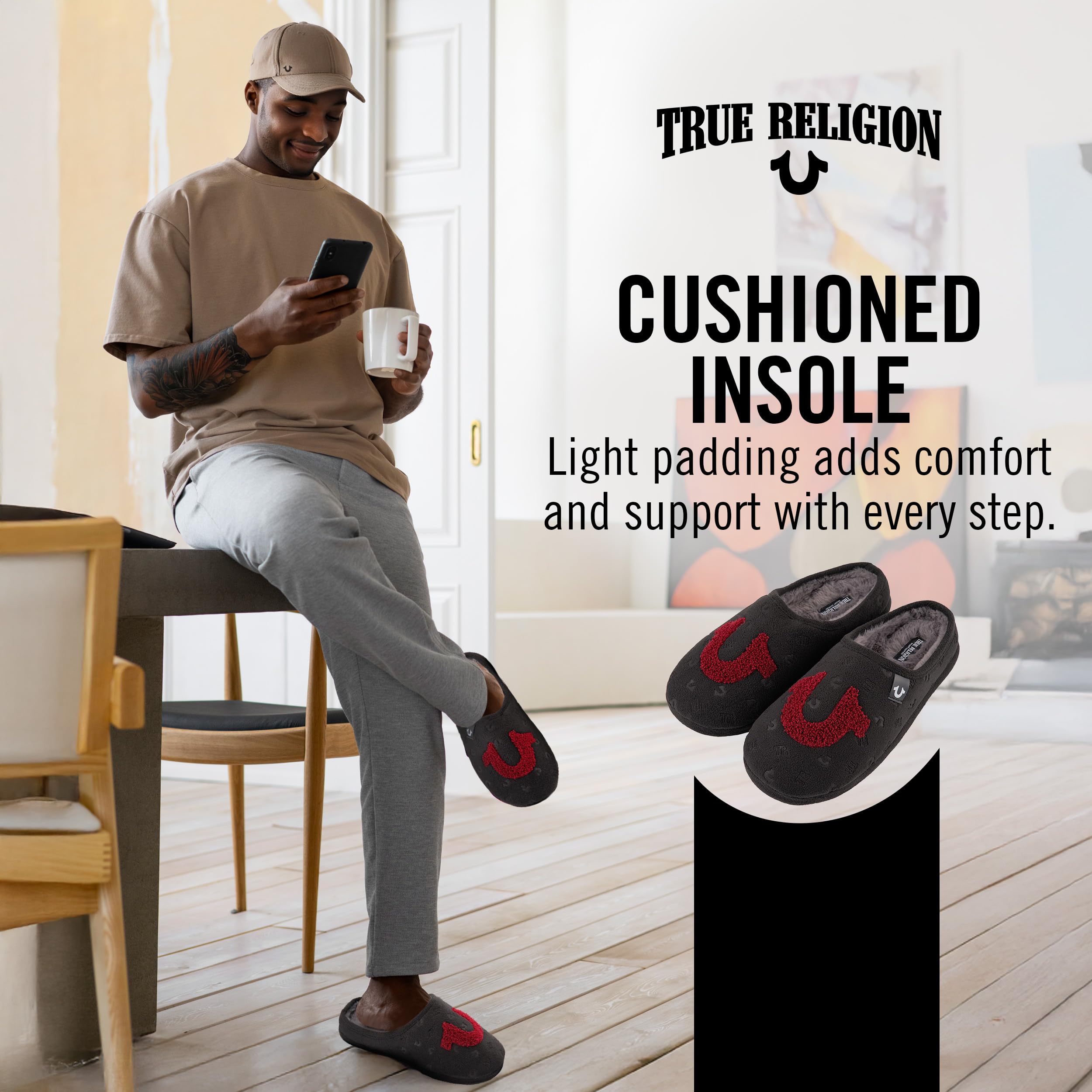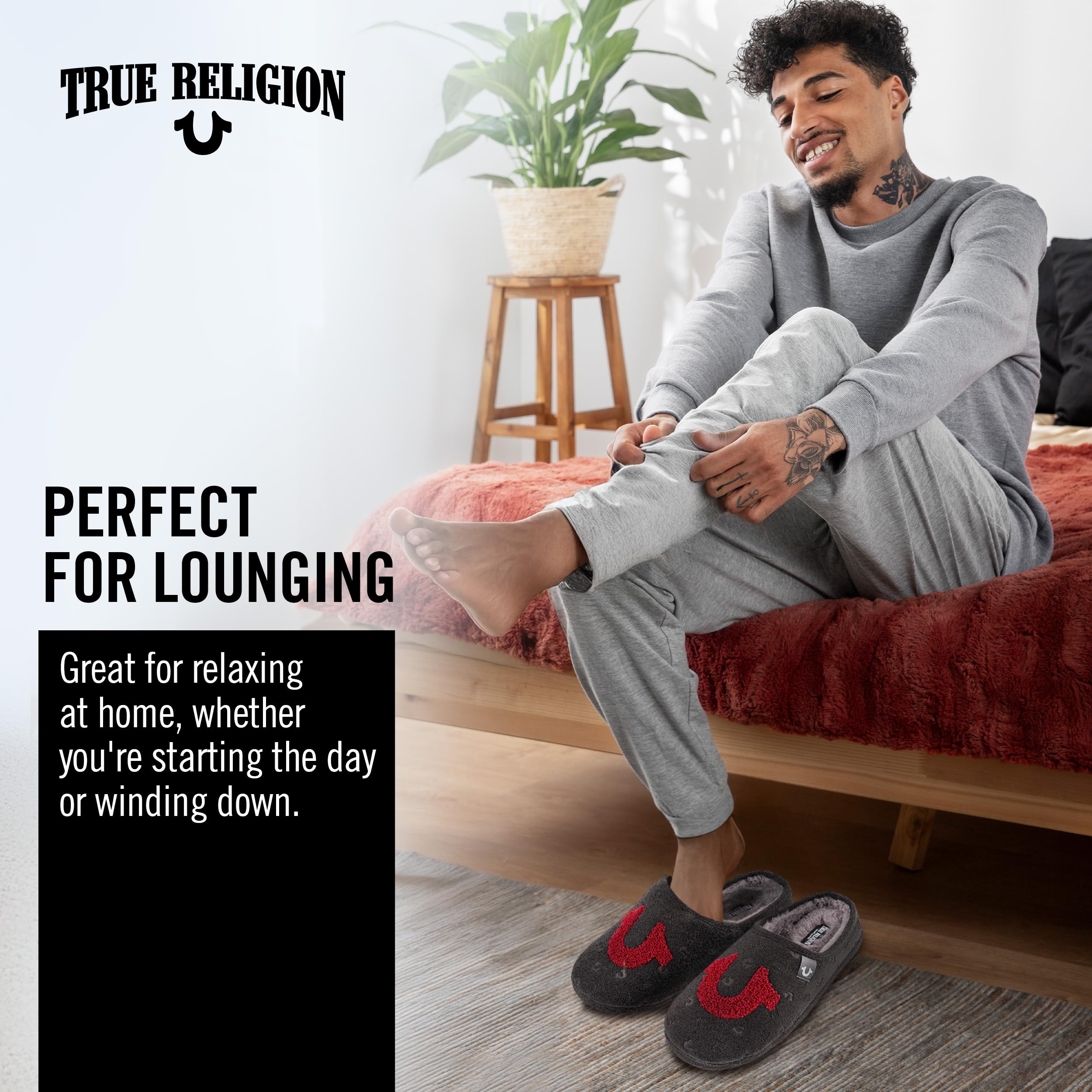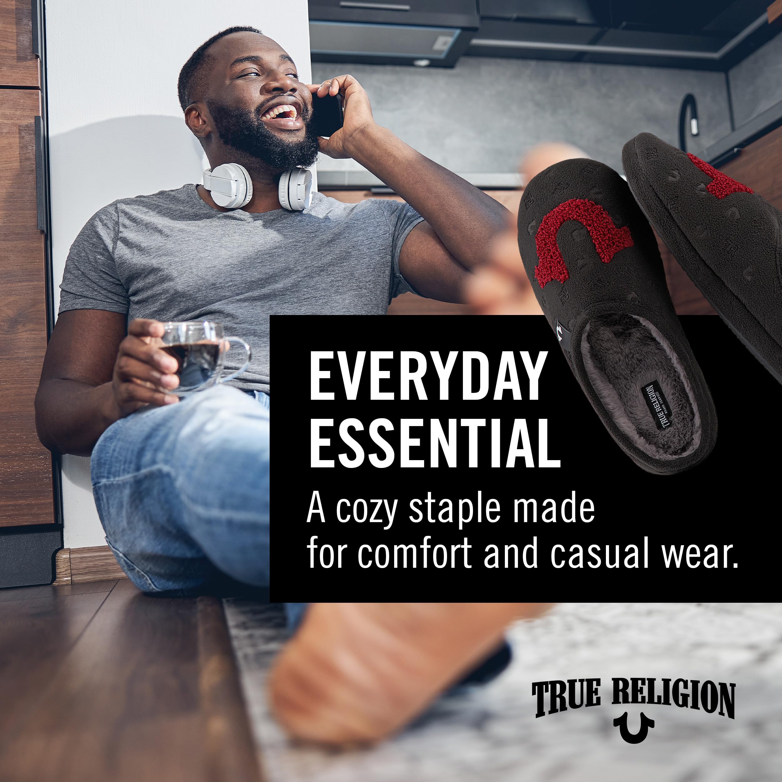 Iconic Branding: With the signature True Religion horseshoe logo front and center, these mens house shoes bring your brand loyalty to your fuzzy slippers lineup.