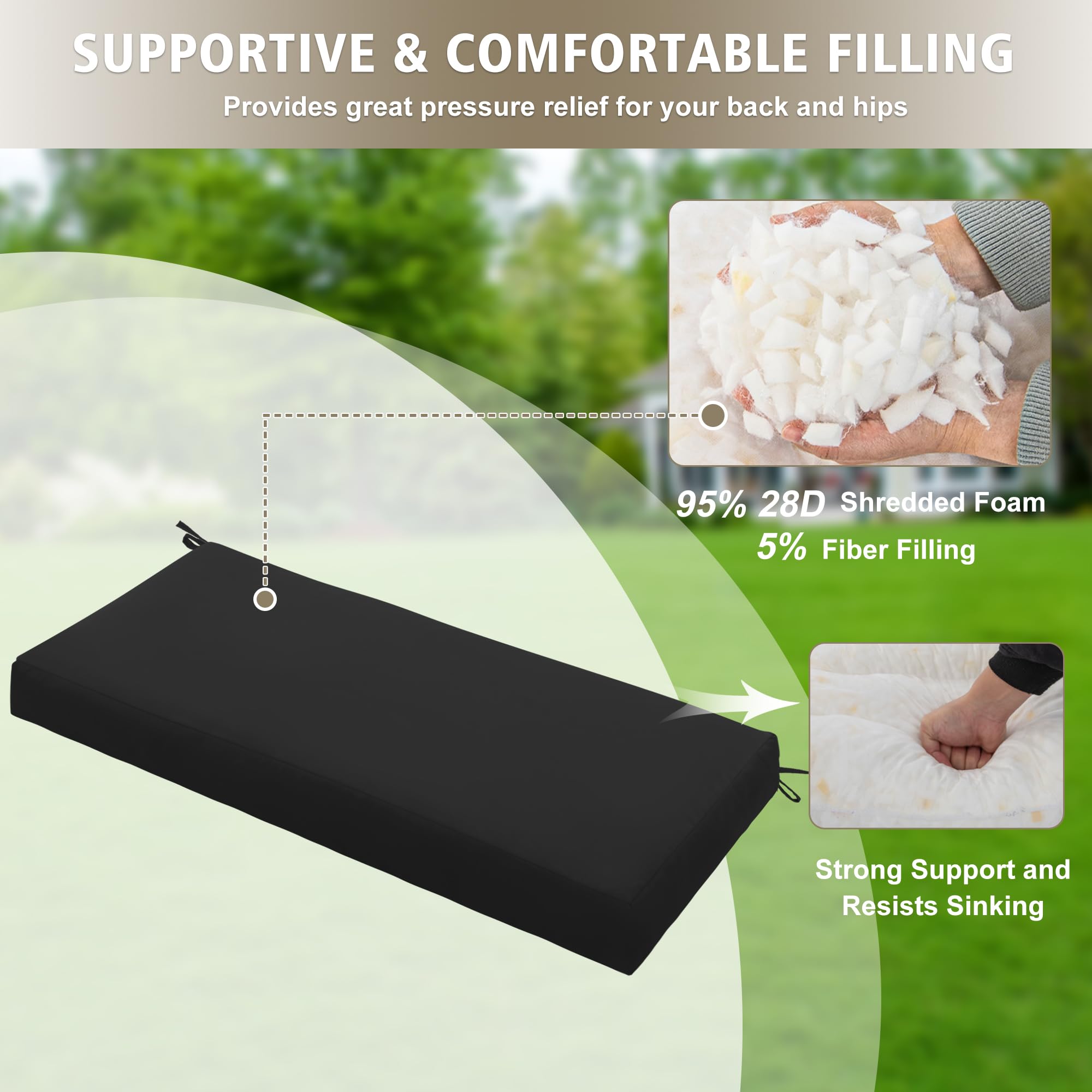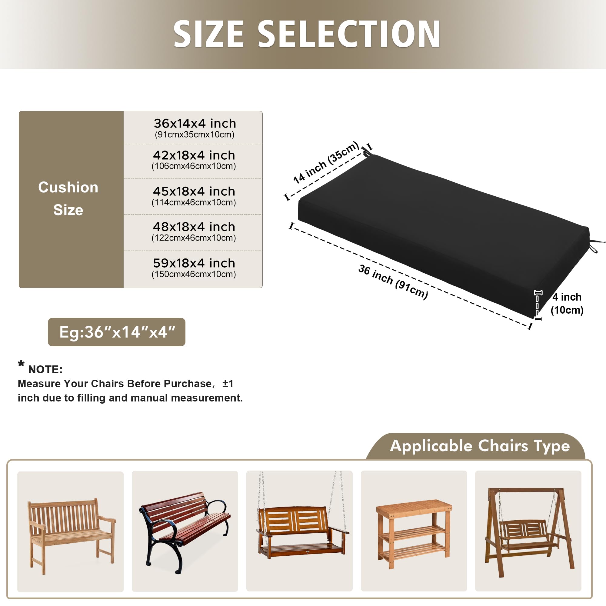 【Enhanced Comfort & Support】: Filled with high-resilience shredded foam, our outdoor bench cushions provide optimal comfort, reducing pressure on your hips. Available in multiple sizes (36"x14", 42"x18", 45"x18", 48"x18", 59"x18"), they offer a plush, supportive seating experience for patio benches, loveseats, entryway benches, piano benches, or porch swings.