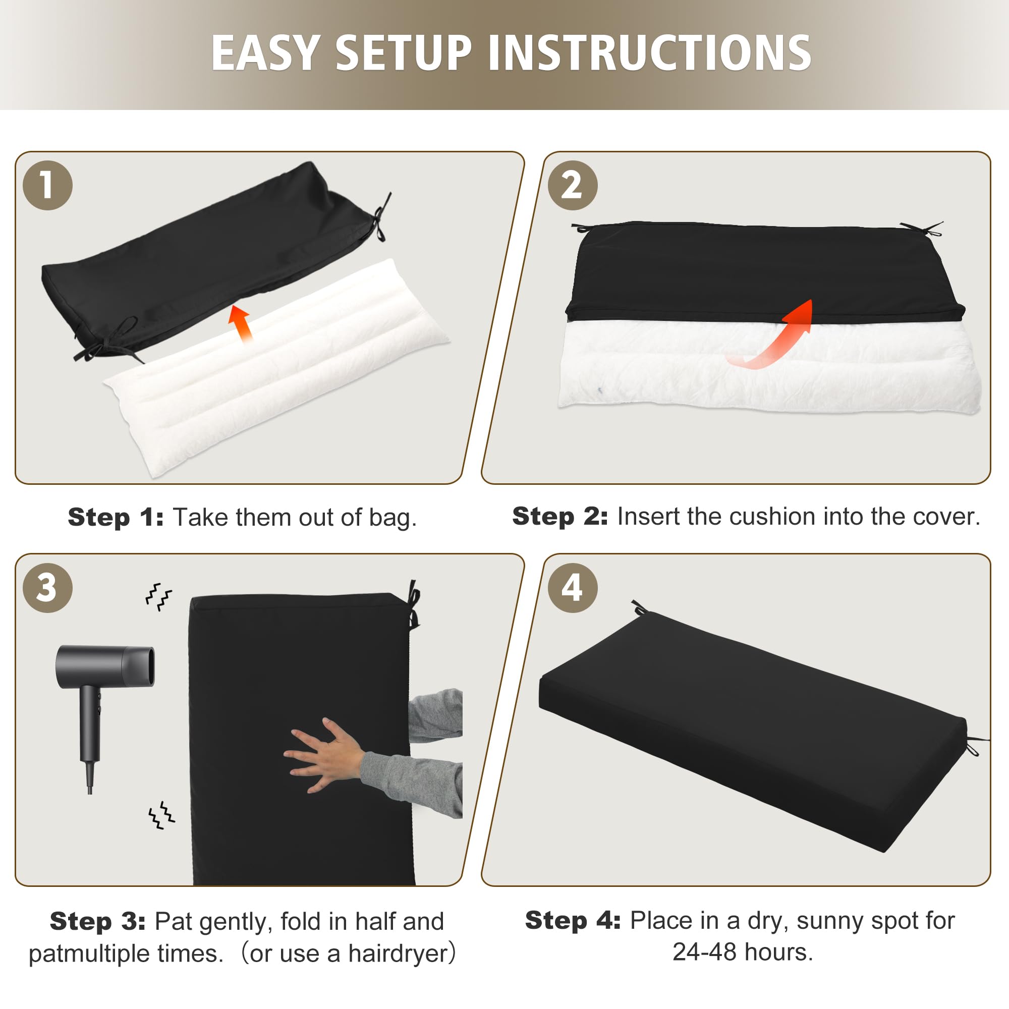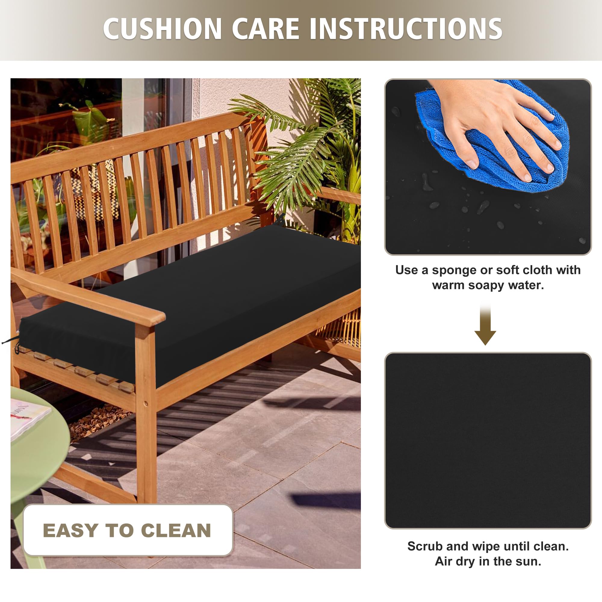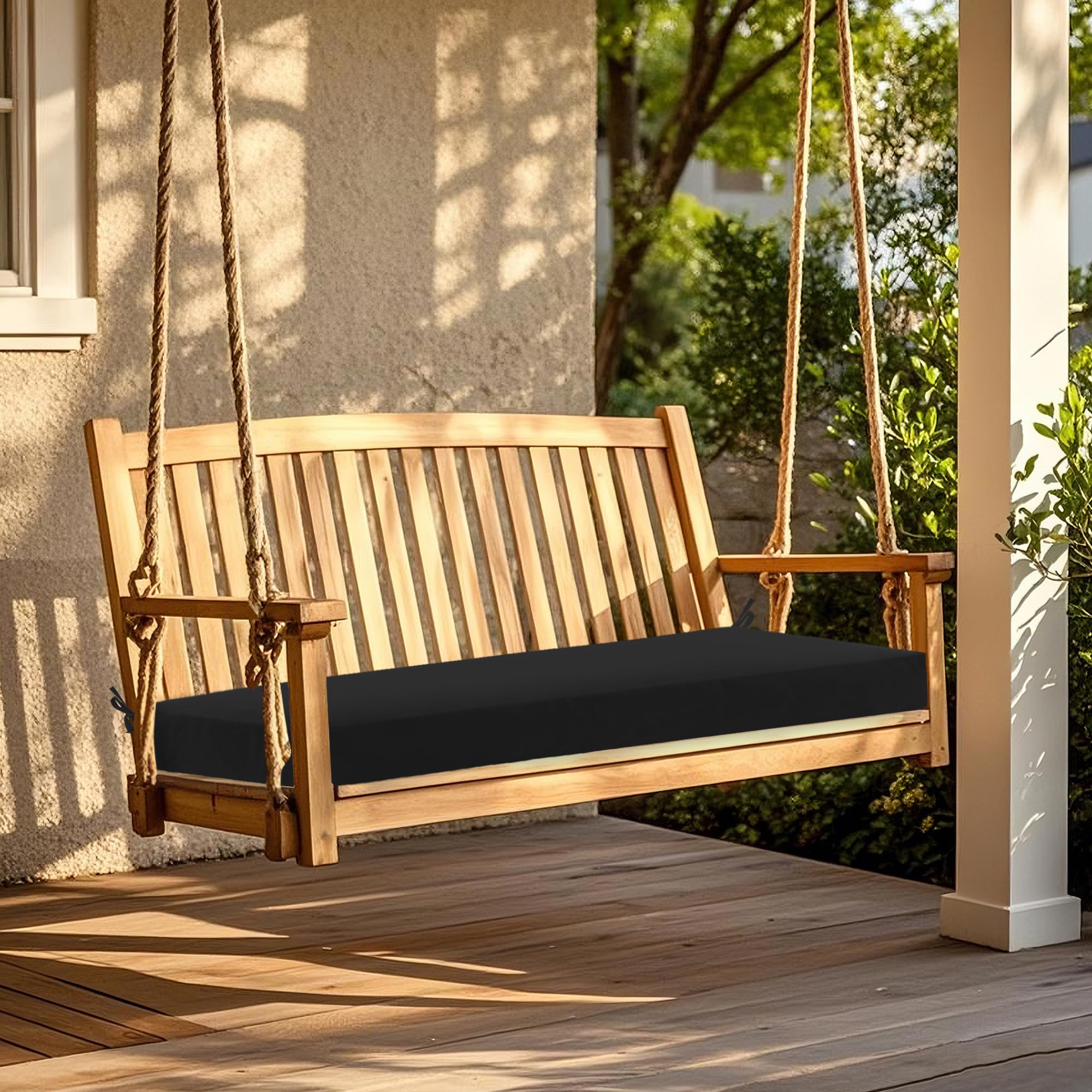Enhance your seating experience with these premium outdoor bench cushions, designed for both comfort and durability. Available in multiple sizes (36"x14", 42"x18", 45"x18", 48"x18", 59"x18"), these cushions are perfect for a variety of spaces, including patios, entryway benches, window seats, and porch swings. Crafted with high-resilience foam, our cushions provide superior comfort by relieving pressure on your back and hips, ensuring a relaxing seating experience. The waterproof, fade-resistant fabric makes them ideal for outdoor environments, withstanding moisture and UV rays without losing their vibrant color over time. Designed for a secure fit, each cushion comes equipped with adjustable tie straps to keep them in place, preventing slipping or shifting, even on breezy days. Whether you’re using them outdoors or indoors, they stay securely attached to your furniture for a comfortable and stable seating experience. Cleaning is made easy with the removable, machine-washable covers. Simply unzip and toss them in the washing machine to maintain their fresh look. These cushions arrive vacuum-sealed for compact shipping and will fully expand within 24-48 hours of unpacking. With seven beautiful color options—Black, Dark Grey, Navy, Sage Green, Teal, Cream, and Burgundy—these cushions are a stylish addition to any outdoor or indoor space, providing both comfort and aesthetic appeal to your furniture.