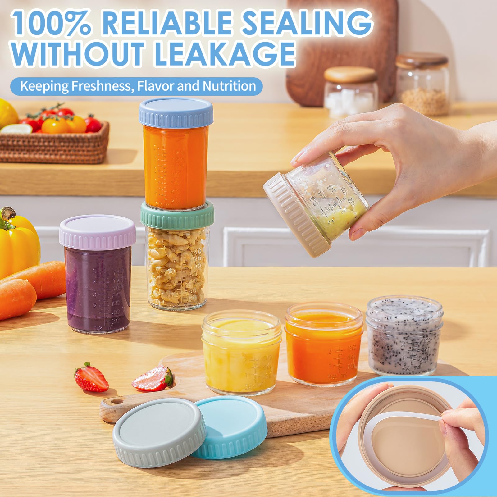 PREMIUM BABY FOOD-GRADE MATERIA: Our jars are crafted from durable food-grade glass for extended life. Lids come in six vibrant colors, made of quality BPA-free plastic for enhanced safety. A stellar choice for worry-free, healthy meals for your baby