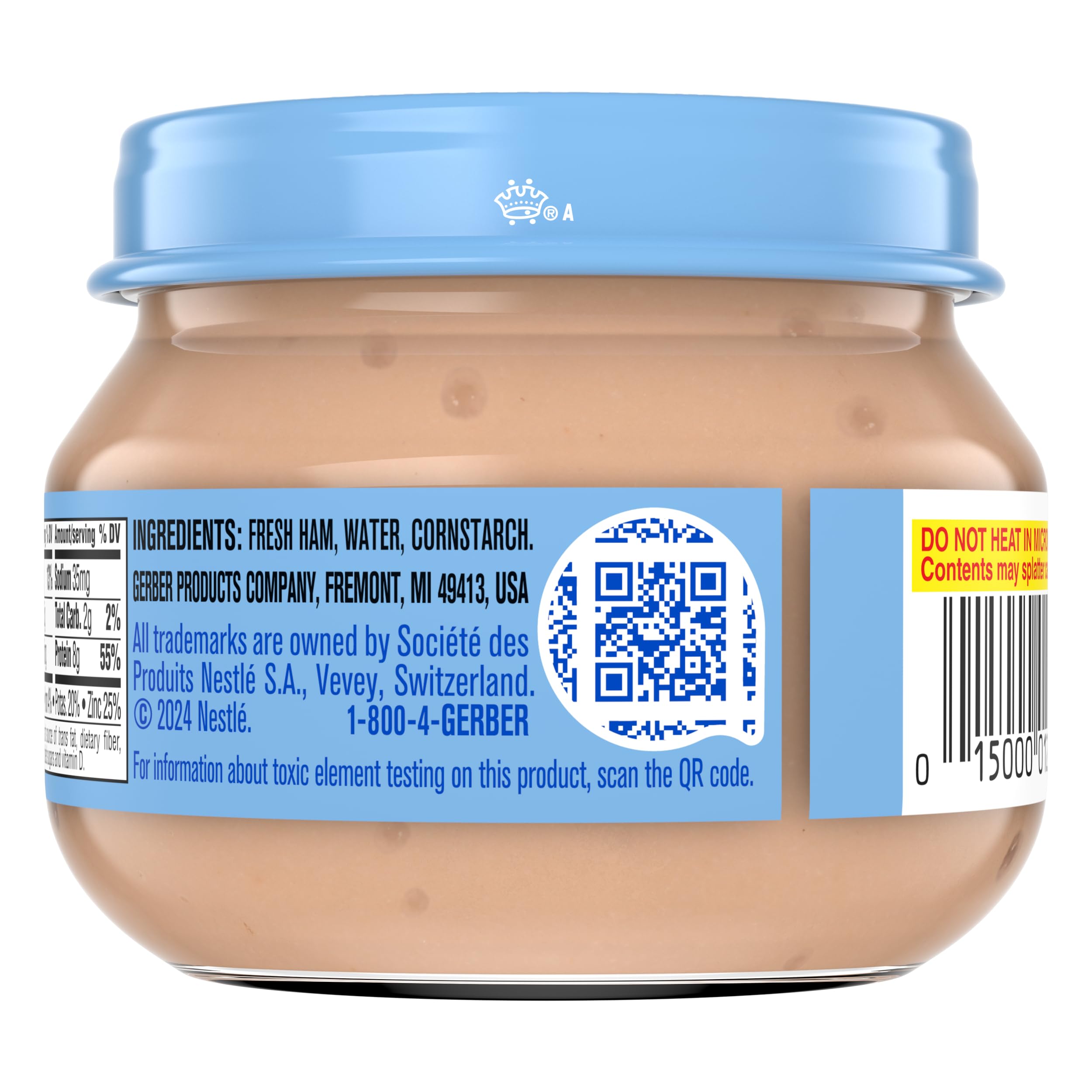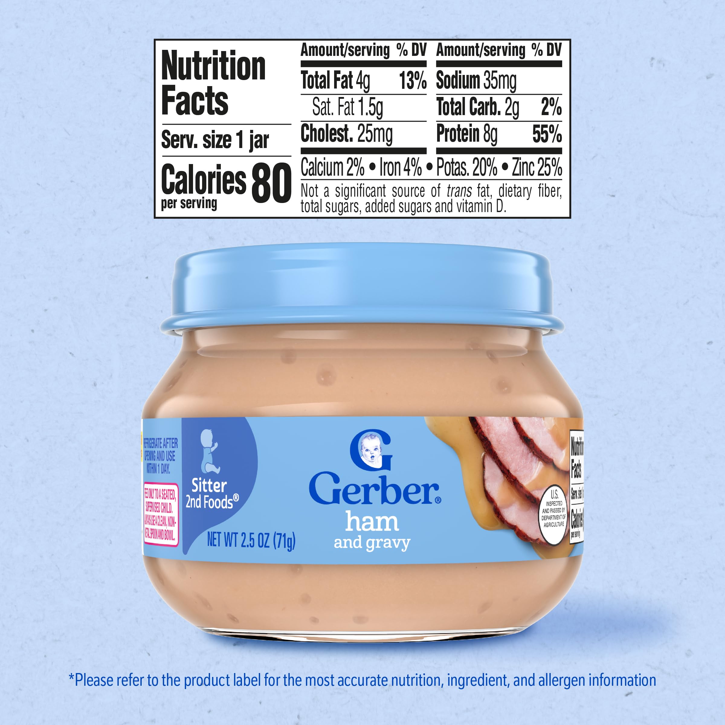 Gerber Ham and Gravy Baby Food Jar is a premium choice for your child and is crafted with wholesome ingredients for your little one. Each ham jar has 25% of the daily value of zinc and 20% of the daily value of potassium. This stage two baby food is designed for babies who are ready to explore new textures and flavors, making it a great addition to your baby's diet. Gerber baby food understands the importance of providing wholesome ingredients. This puree baby food offers tender ham, finely pureed to ensure a smooth and enjoyable eating experience for your baby.