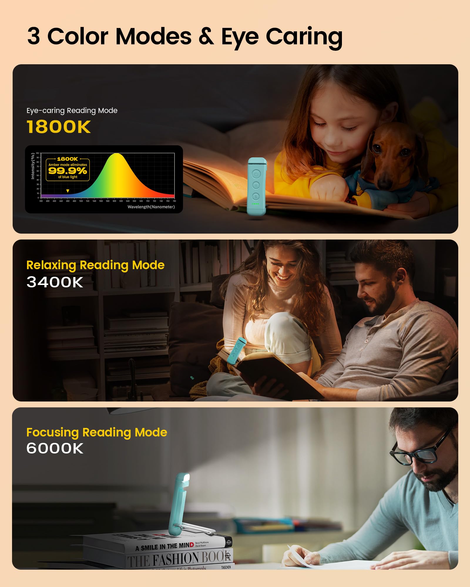[3 Color Modes & Eye Caring] Unlike other book lights, our tiny reading lights for books in bed has 3 different reading modes: amber mode(1800K), breeze mode(3400K), and precise mode(6000K). Amber mode filters 99.9% blue light to protect your eyes and reduce your eye strain. The breeze mode provides you with a cozy and comfortable reading world for novel reading & poem reading. The precise mode highlights the area clearly and so you can concentrate on every detail of your book.