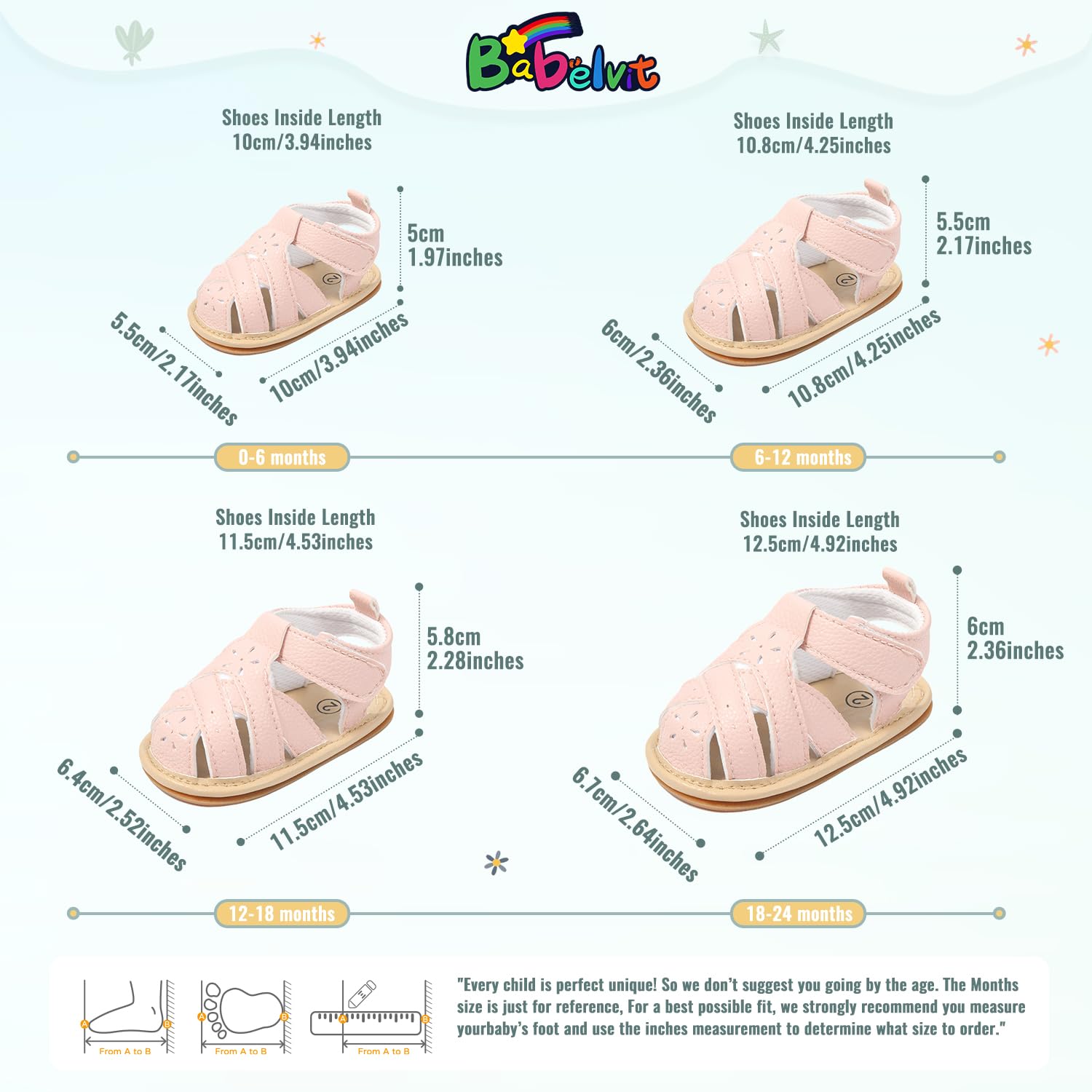 ABOUT SIZE: We love our customer. Please measure the feet, the months age is just for reference, if you measure your baby’s foot then follow our size inches chart they fit great. If your baby has a fatter feet, please buy a size larger. Thanks in advance