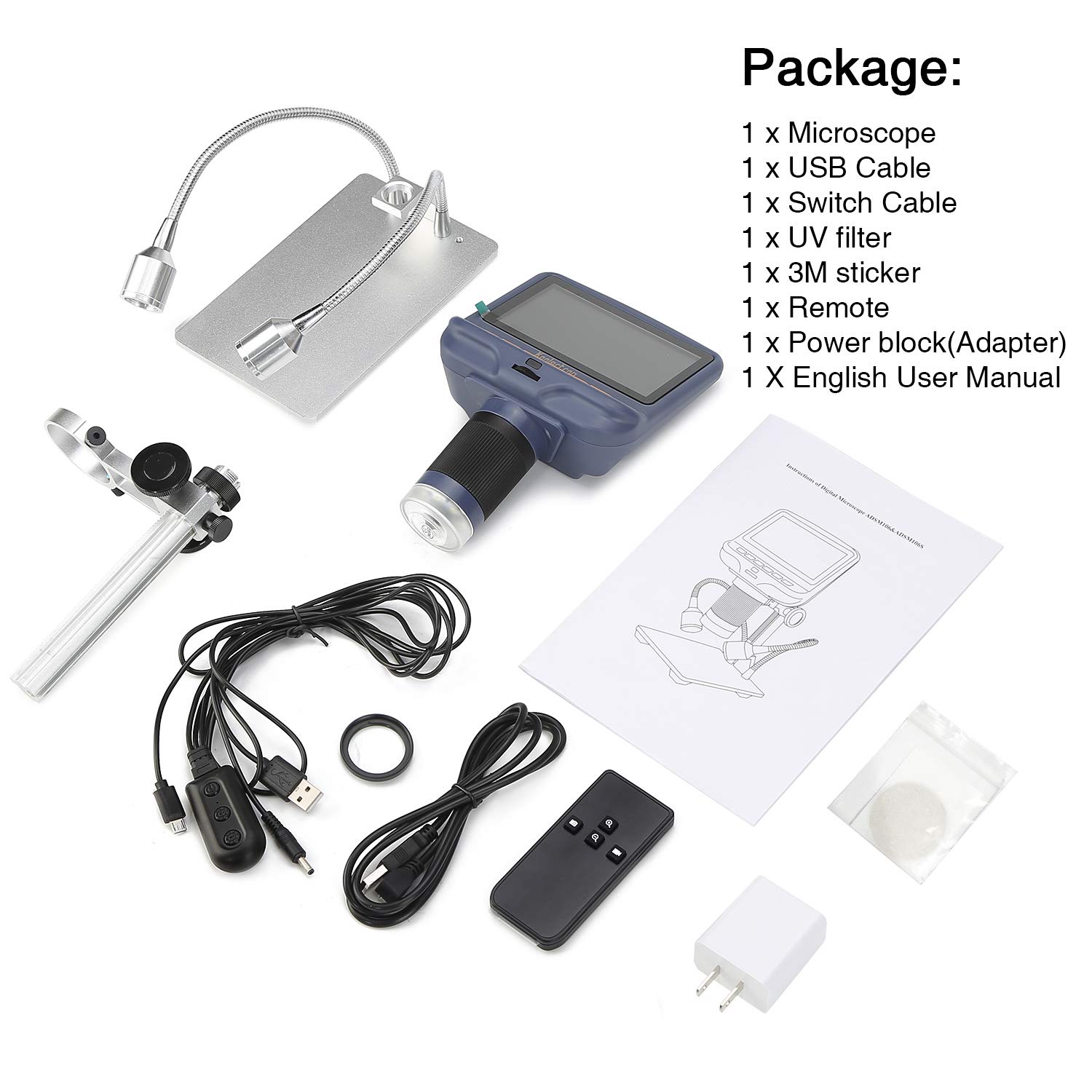 Note: (1)You can watch from It's LCD screens.or you can install memory card to store the photo or video.then,watch form computer by memory card.If want to watch from computer directly,you can download AMCAP from Google (2)It works with Windows XP SP2/ Vista/Win7/Win8/Win10,but can not support ios system.If you can not connect it with computer,Pls contact us at first. (3)There is no battery in the remote control,you need to purchase CR2025 battery by yourself (4)There is a screen protective film on the screen.If the protective film is scratched, it is recommended to tear off the protective film when first use. (5)There is a protective cover outside the lens,please remove the lens protection cover and install the UV filter when using the microscope. Specifications: Image sensor: High quality HD sensor Magnifications: 10X-220X (when connecting 21 inches PC) Sensors: High-performance light-sensitive chips Lens: High quality microscopic lens Light sources: 8 LEDs with adjustable brightness&2 LED with the stand Base: Lifting bracket base Image resolution: 1280x720,4032x3024 Video resolution: 1080P FHD, 720P Image Format: JPG Video format: AVI Power supply: 5V DC USB Computer interface: USB 2.0 Photo/video: Support Package: 1 x Desktop Mini Microscope 1 x Stand 1 x USB Cable 1 x Remote control 1 x UV filter 1 X User Manual