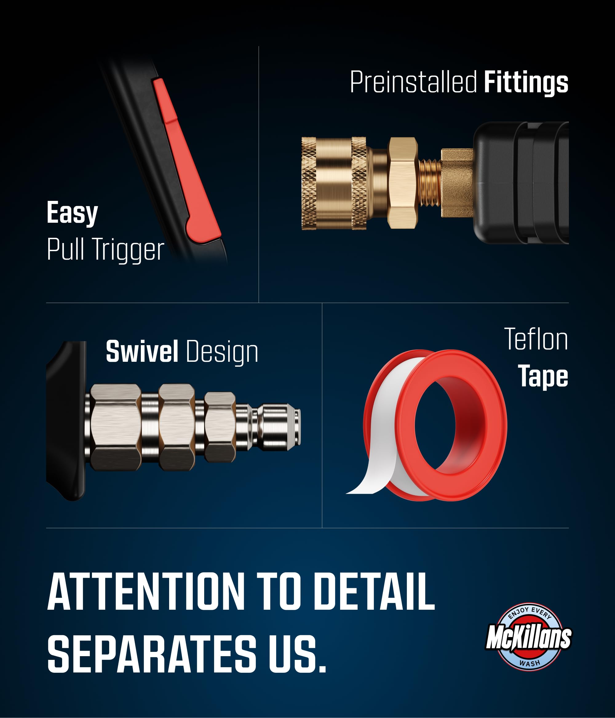 ✅ Made for Detailing Enthusiasts: The McKillans Pressure Washer Gun is the perfect upgrade for your power washer. The integrated swivel helps save you time by keeping your hose tangle free. The small body design makes the gun easy to handle and maneuver. Stop using the long, leaky, and cheap stock gun that comes with your pressure washer, and upgrade to a quality gun. The small design makes it perfect to use with the foam cannon!