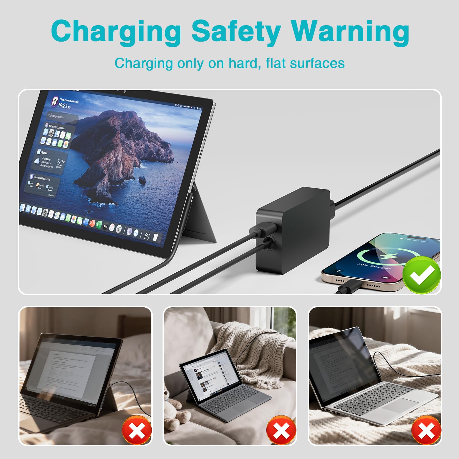 Safety Notice: To prevent overheating and potential damage, never charge your laptop with this charger on beds, sofas, or blankets. Blocked ventilation can cause excessive heat, which may lead to shortened charger life and safety risks