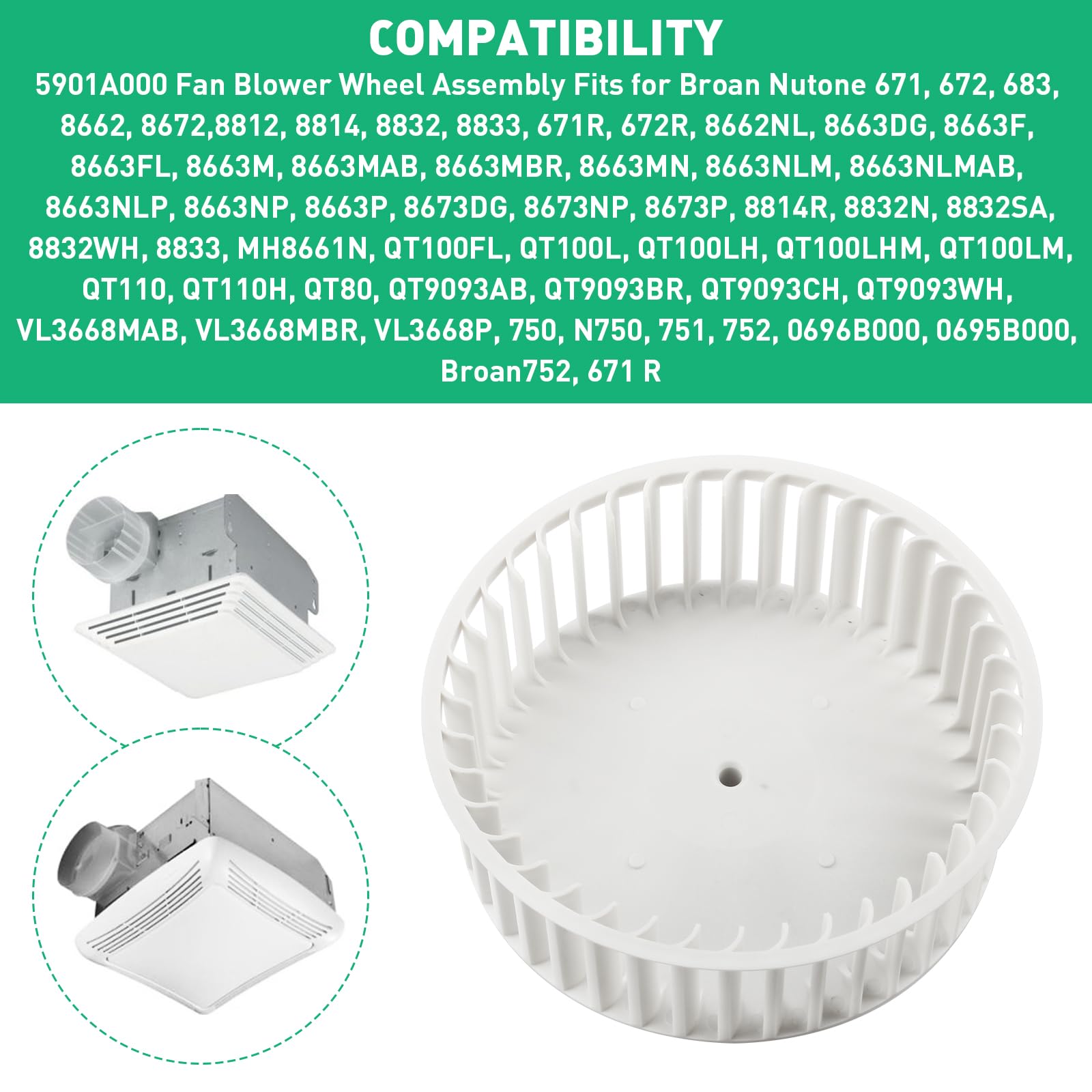 【Compatibility】5901A000 Fan Blower Wheel Assembly Fits for Broan Nutone 671, 672, 683, 8662, 8672, 8812, 8814, 8832, 8833, 671R, 672R, 8662NL, 8663DG, 8663F, 8663FL, 8663M, 8663MAB, 8663MBR, 8663MN, 8663NLM, 8663NLMAB, 8663NLP, 8663NP, 8663P, 8673DG, 8673NP, 8673P, 8814R, 8832N, 8832SA, 8832WH, 8833, MH8661N, QT100FL, QT100L, QT100LH, QT100LHM, QT100LM, QT110, QT110H, QT80, QT9093AB, QT9093BR, QT9093CH, QT9093WH, VL3668MAB, VL3668MBR, VL3668P, 750, N750, 751, 752, 0696B000, 0695B000, Broan752, 671 R