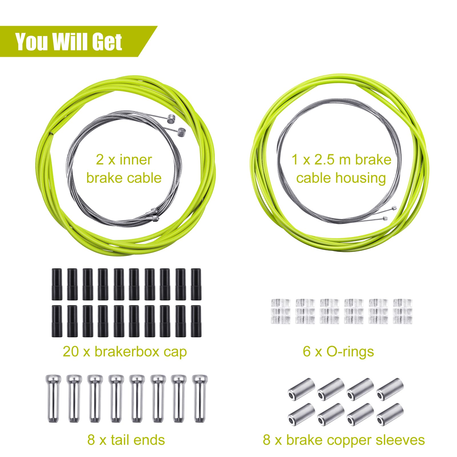 Ample quantity: you will receive 1 piece 2 m transmission cable shell (4 mm), 2 pieces inner variable speed cable, 1 piece 2.5 m brake wire outer tube (5 mm), 2 pieces inner brake cable, 6 pieces O rings, 8 pieces tail ends, 8 pieces brake copper sleeves, 20 pieces cable ferrules, large amount of quantity