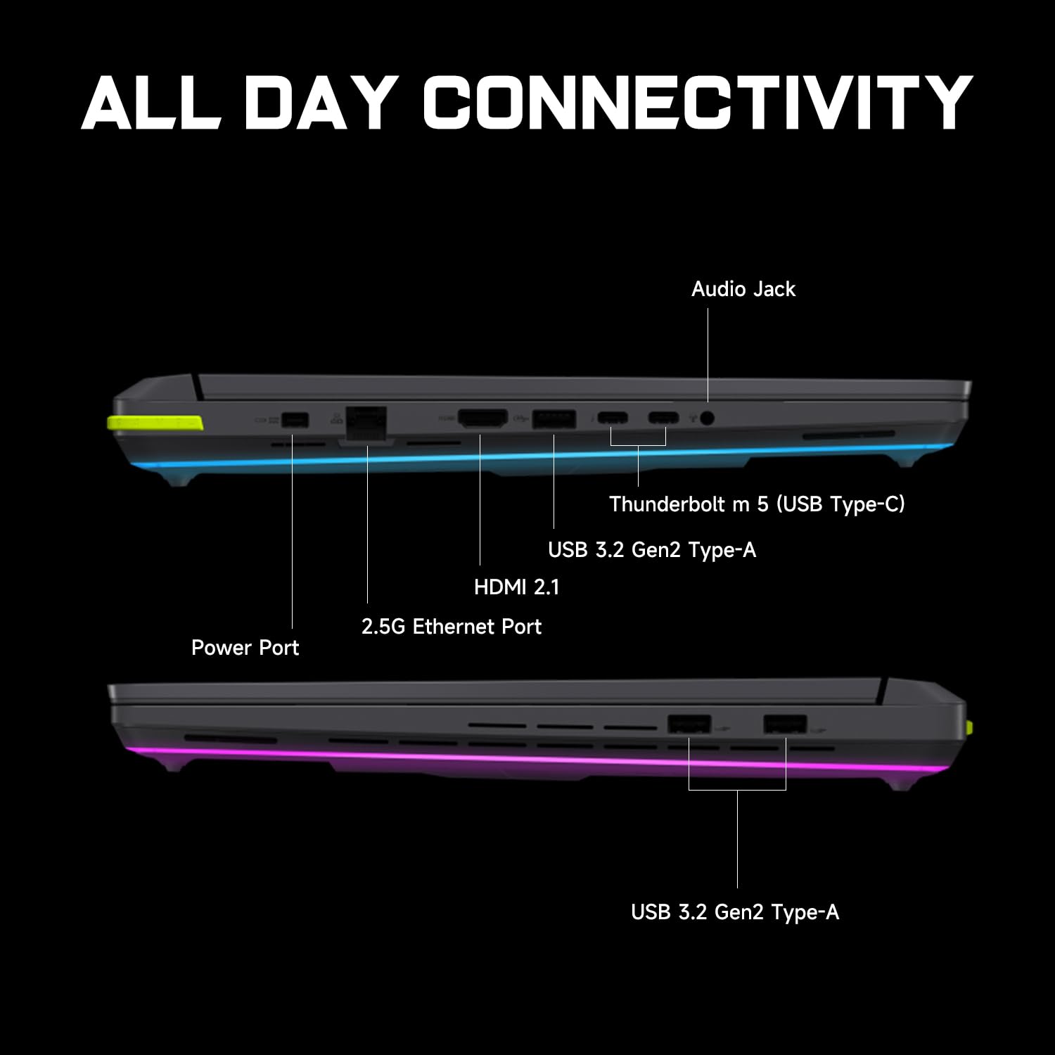 【Tech Specs】1x 3.5mm Combo Audio Jack, 1x HDMI 2.1 FRL, 3x USB 3.2 Gen 2 Type-A, 1x 2.5G LAN port, 2x Thunderbolt m 5, 1x Power Port, RGB Backlit Keyboard (Fn+F2&F3), IR camera; Wi-Fi 7 & Bluetooth