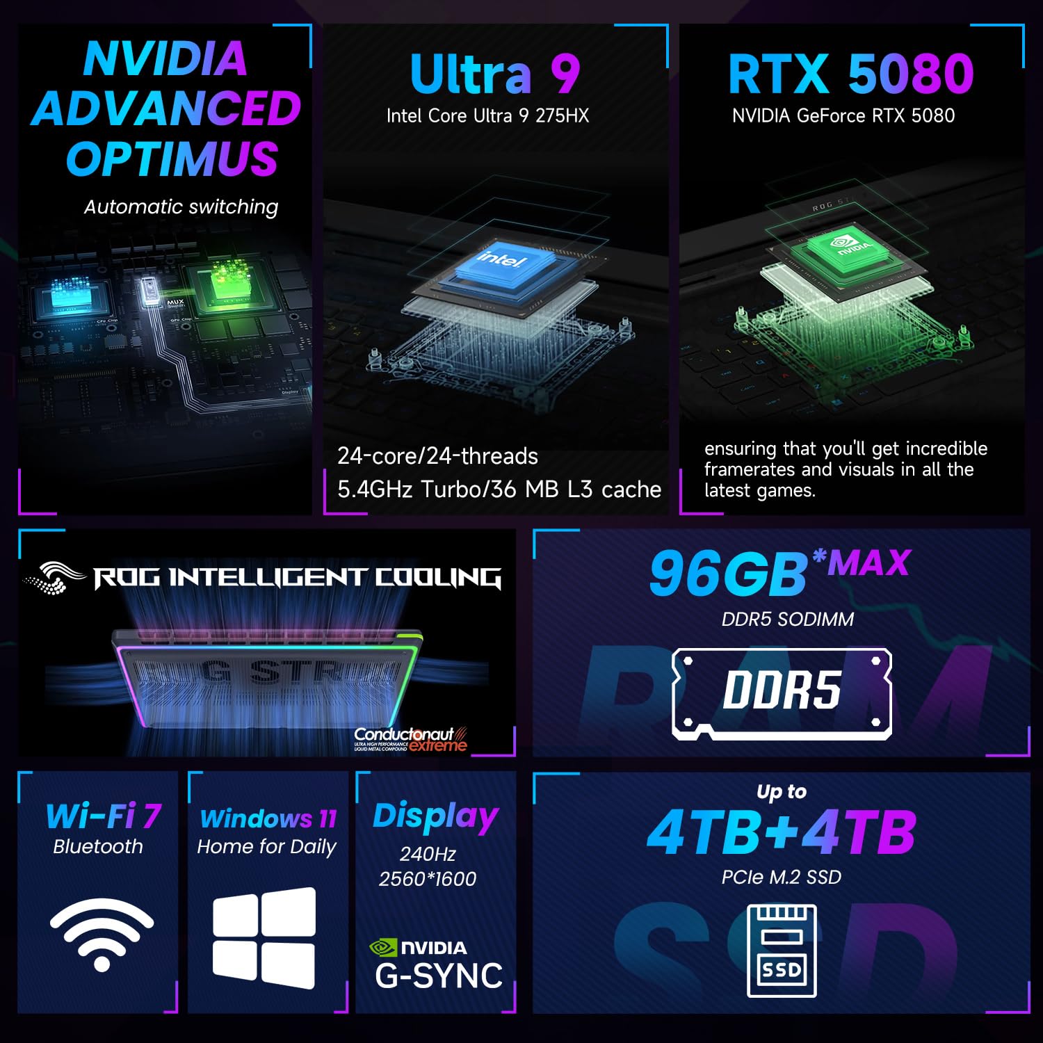 Key Features and Benefits: CPU:Intel Core Ultra 9 275HX Processor (24 Cores, 24 Threads, 36MB L3 Cache, Base Frequency at 2.1 GHz, Up to 5.4 GHz at Max Turbo Frequency ) Memory: Up to 96GB DDR5 RAM Hard Drive: Up to 8TB SSD Operating System: Windows 11 Home Graphics: NVIDIA GeForce RTX 5080(16GB GDDR7) Display:16" WQXGA 2560*1600 Non-touch 240Hz Ports: 1x 3.5mm Combo Audio Jack 1x HDMI 2.1 FRL 3x USB 3.2 Gen 2 Type-A 1x 2.5G LAN port 2x Thunderbolt m 5 1x Power Port Optical Drive: None Media Drive: None Keyboard RGB Backlit Keyboard(On: Fn+F2&F3) Wireless Connection: Wi-Fi 7 and Bluetooth Dimensions: 13.94" x 10.55" x 1.21" Weight: 5.84 lbs Color: Grey Bundle with: HyperX Cloud Gaming Headset