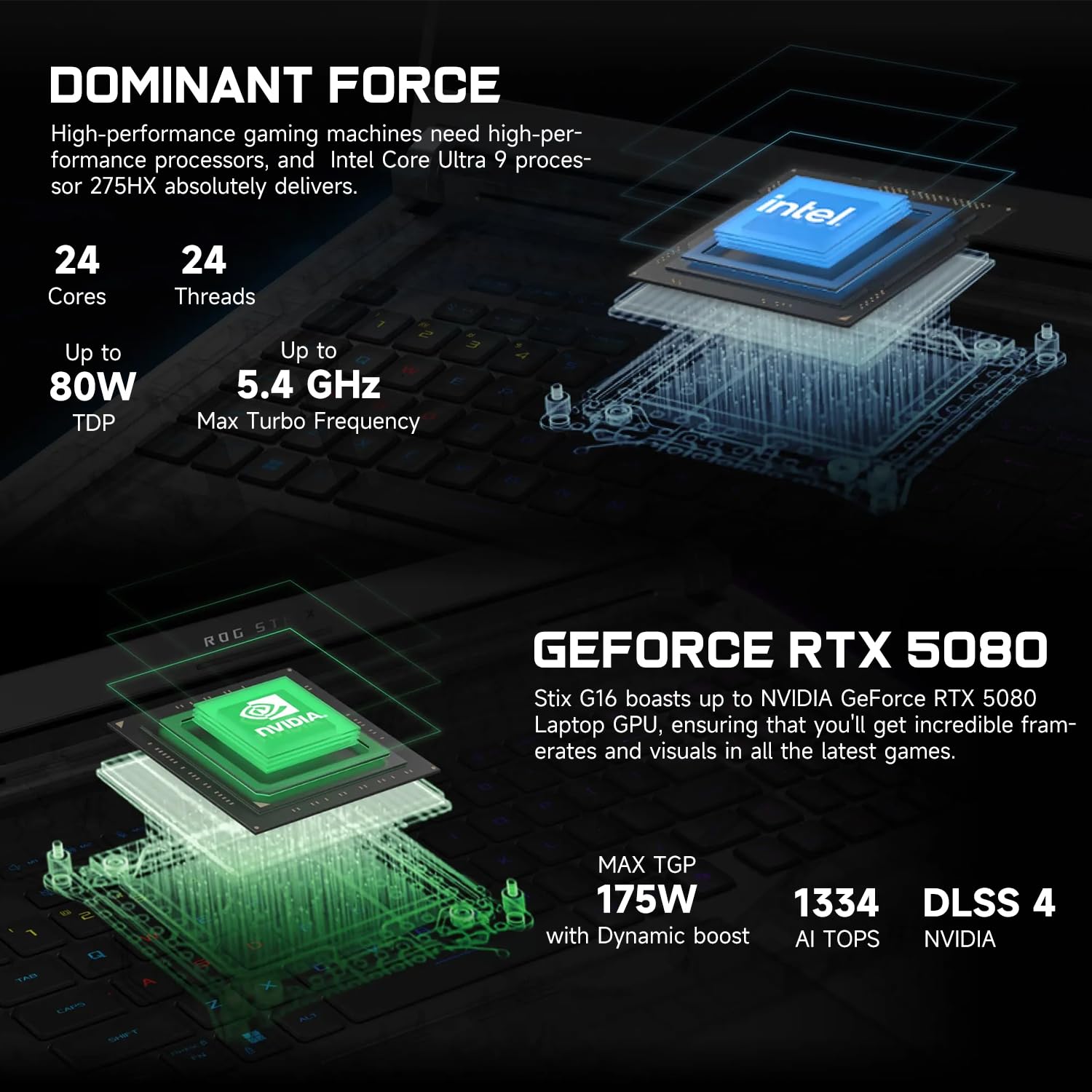 【Processor】Intel Core Ultra 9 275HX (24 Cores, 24 Threads, 36MB L3 Cache, Base Frequency at 2.1GHz, Up to 5.4GHz at Max Turbo Frequency), with NVIDIA GeForce RTX 5080 Graphics (16GB GDDR7).