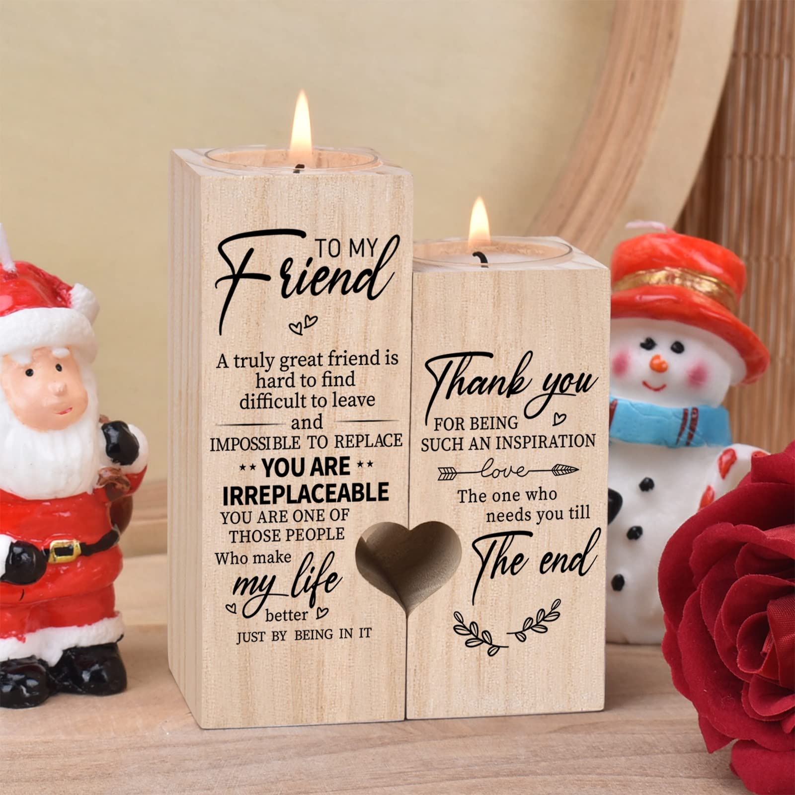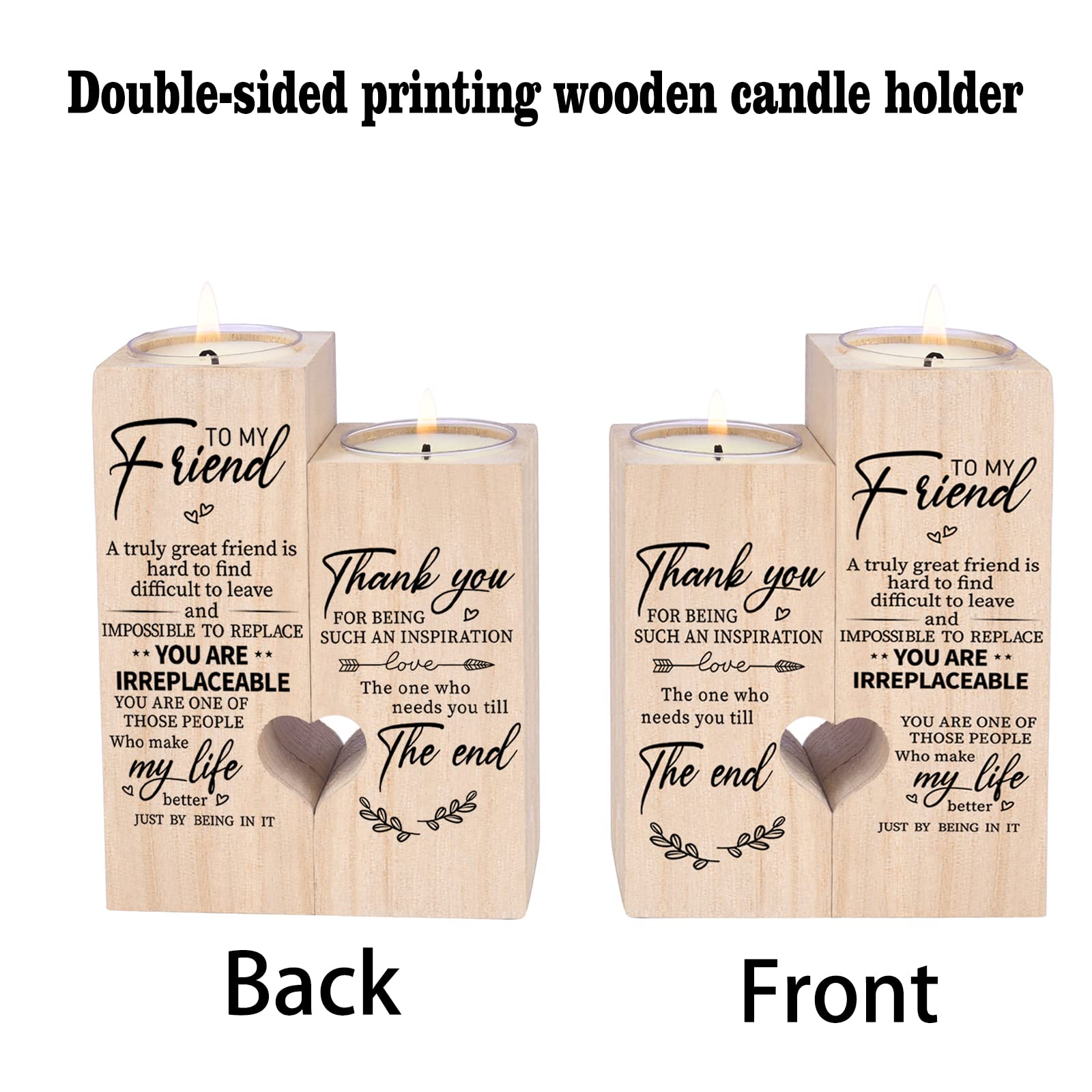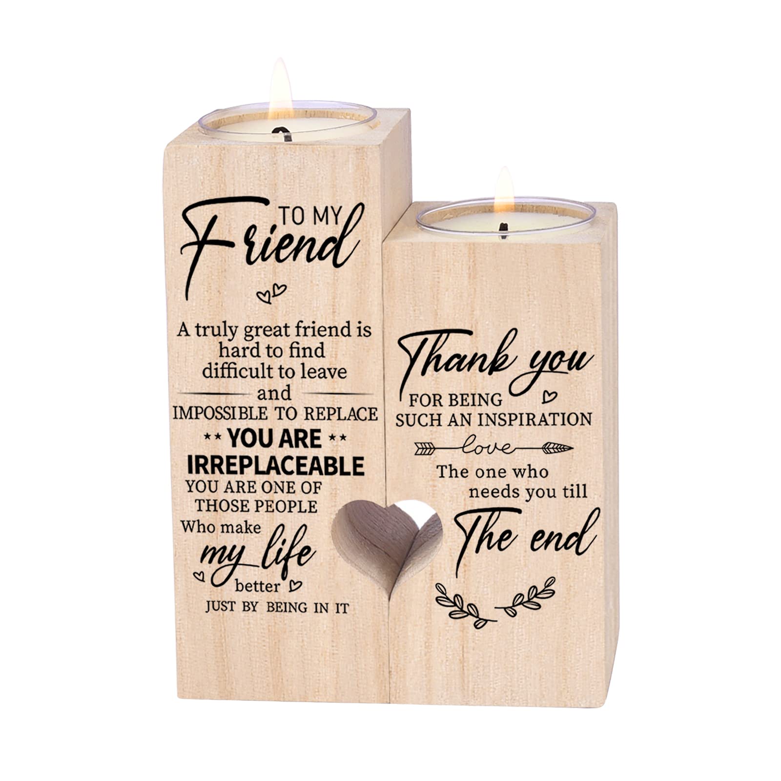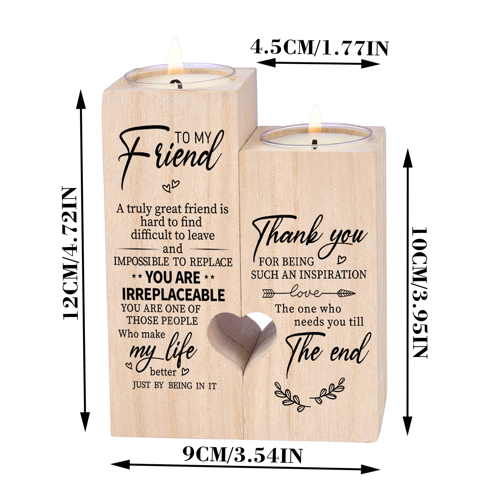 1.Personalized wooden candlestick-best friend birthday gifts for women、best friend birthday gifts for women、gifts for best friend、friend candle、friendship candle,It is a testimony of your friendship. 2.There are many ways to express your special feeling to your friend. You can light this candle and tell her how special she is to you. 3.Information is carved on wood forever.The perfect gift she would love. 4.Double-sided engraved letters:To MY Friend, A turely great friend is hard to find difficult to leave and IMPOSSIBLE TO REPLACE,YOU ARE IRREPLACEABLE,YOU ARE ONE OF THOSE PERSON Who make my life better JUST BY BEING IN IT.Thank you FOR BEING SUCH AN INSPIRATION LOVE →The one who needs you till The end. 5.A variety of choices, suitable for anniversaries, birthdays, Christmas or other holidays, Surprises Your FRIEND With This Gift and Melt Her Heart! Specification: 1.Material: solid wood 2.Size:4.72IN*3.54IN*1.77IN 3..Matching:2 scented candles