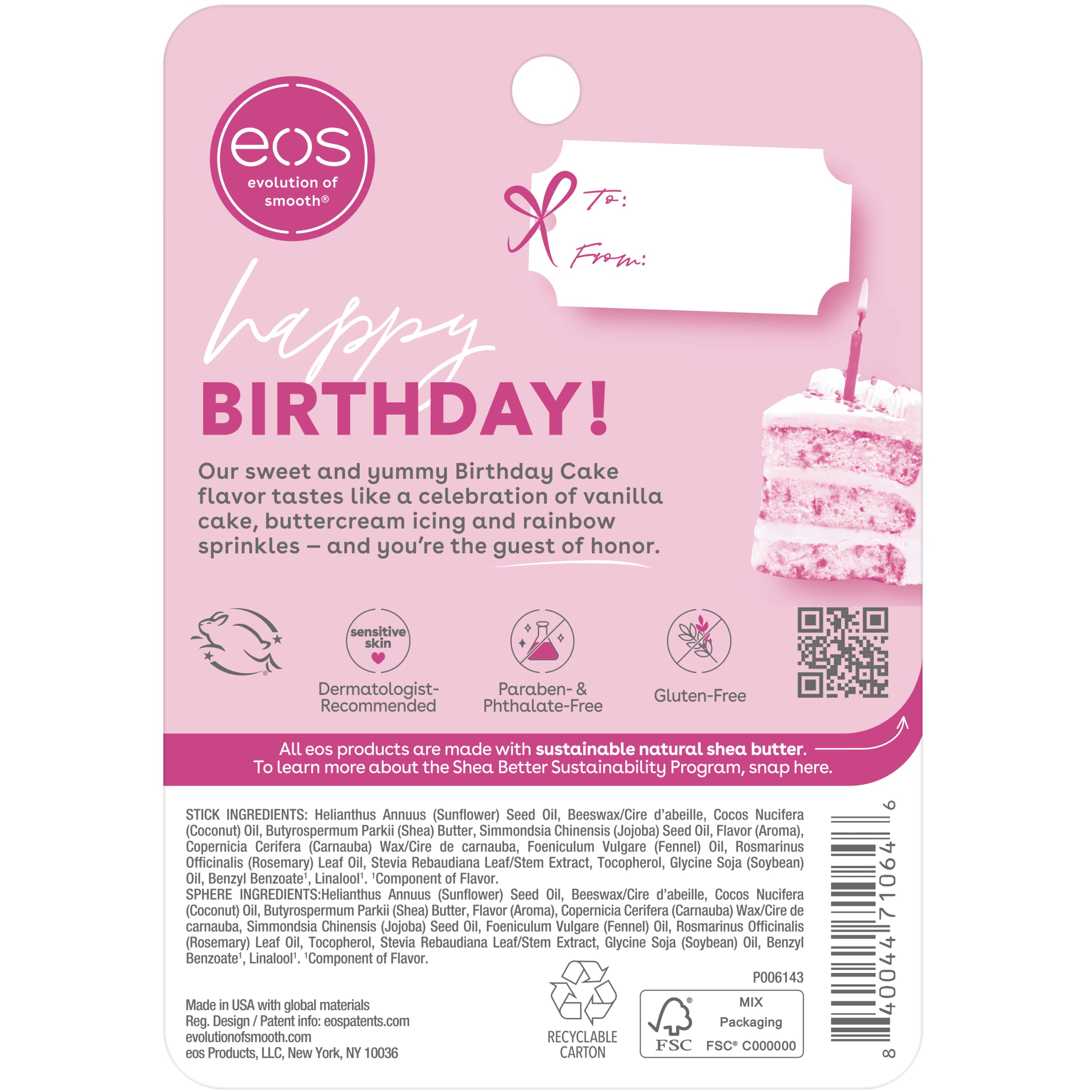 Discover a lip balm that’s natural and delicious. Our sweet and yummy birthday cake flavor tastes like a celebration of vanilla cake, buttercream icing and rainbow sprinkles. eos Natural Shea, dermatologist-recommended lip balm is formulated for sensitive skin and made with soothing shea butter, weightless coconut oil, and protective antioxidants. eos lip balms use sustainably sourced ingredients that provide all-day moisture and are sure to leave your lips feeling buttery smooth, hydrated, and with a delicious taste all day long.