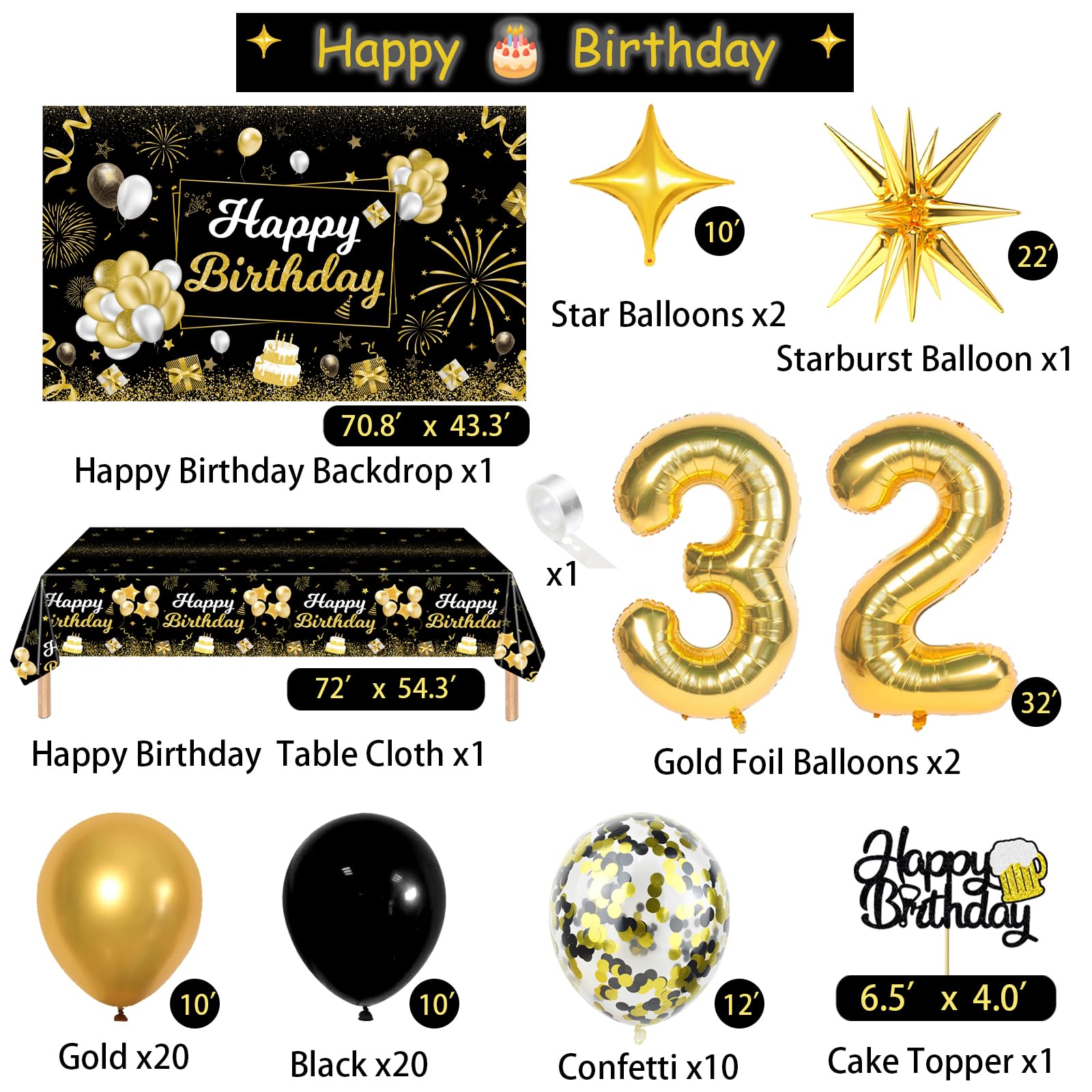 What You Will Receive: 32nd Birthday Decorations include 70.8x43.3in ‘happy birthday’ backdrop *1pcs, 72x54.3in tablecloth *1pcs, 32in number *2pcs, 6.5in cake topper *1pcs, 22in explosion star balloon *1pcs, 10in star balloon *2pcs, 10in metallic gold balloons *20pcs, 10in black balloons *20pcs, 12in black and gold confetti balloons *10pcs, balloon tool *1pcs.