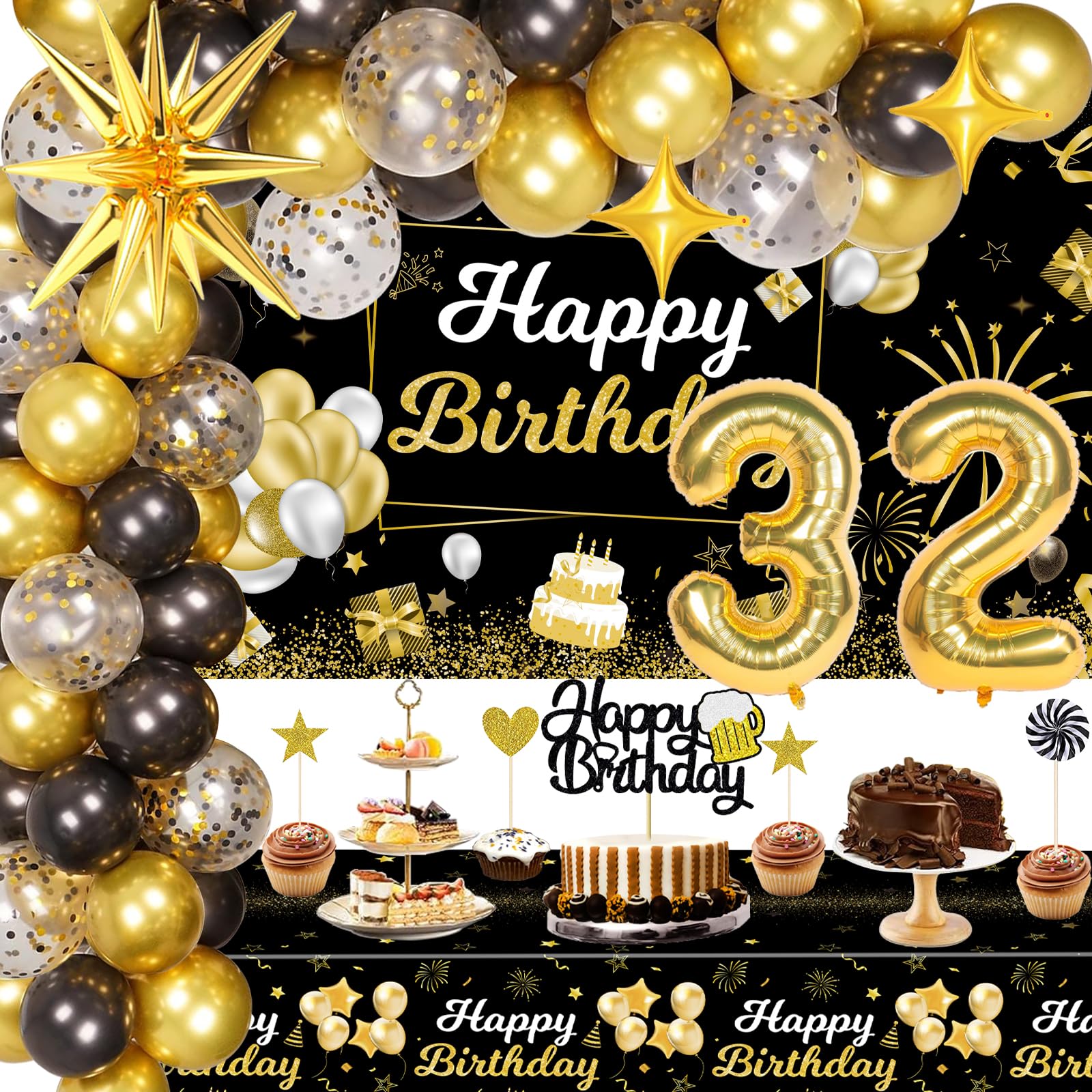 Gold 32nd Birthday Decorations: Our 32nd birthday decorations with backdrop banner, tablecloth, balloons arch are definitely a perfect 32nd birthday gift for him. Black and Gold theme decorations are suitable for men’s birthdays party.