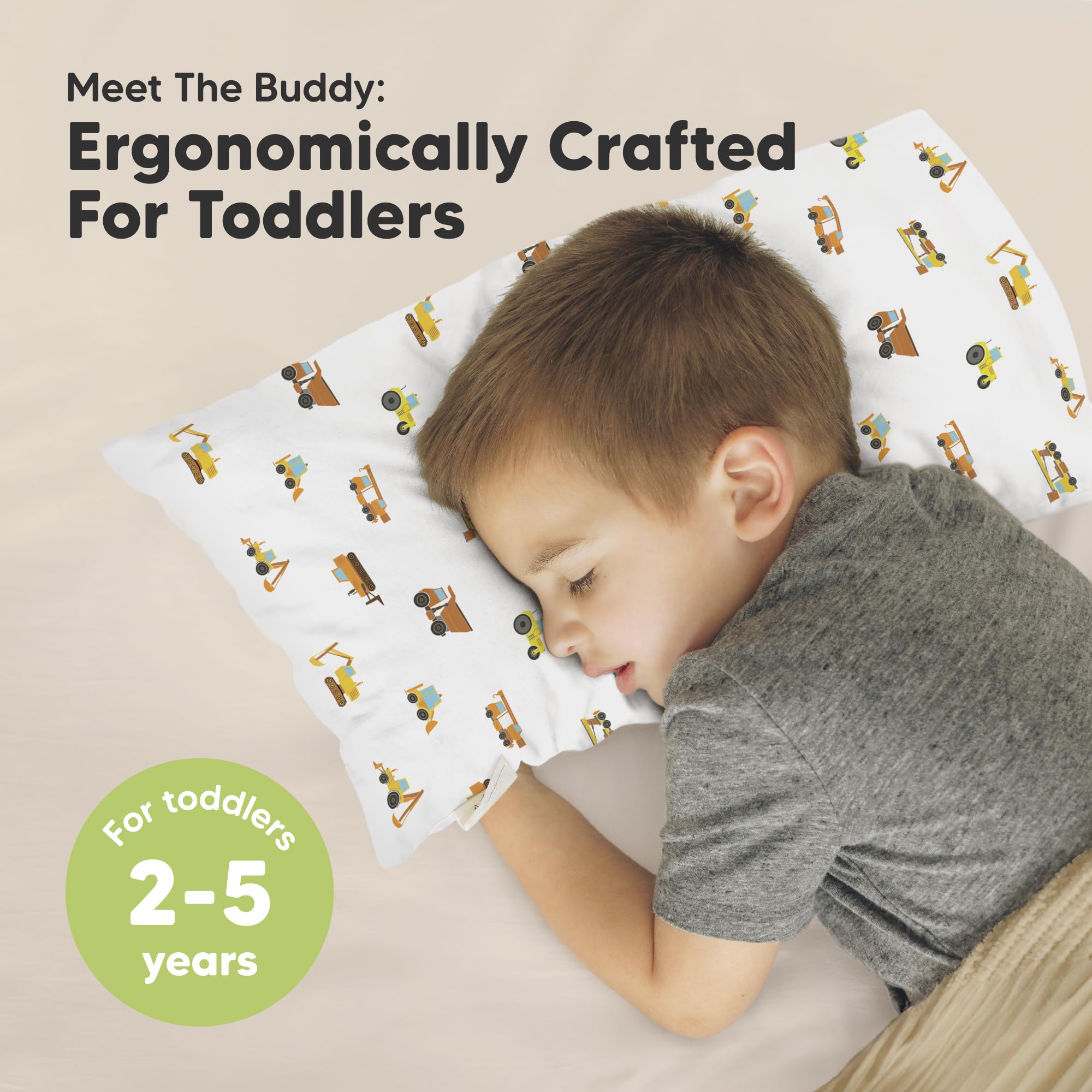 Safe and Natural – We used OEKO-TEX 100 Standard Certified Cotton, and GOTS Certified CU 1042833, for our Buddy Toddler Pillows and Pillowcases. Gentle, breathable, natural – The perfect kids pillow for toddler age 2 to 5.