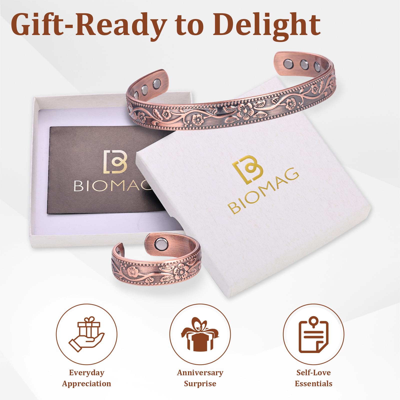 Ready for Gift Giving: Our copper magnetic bracelet and ring set is packed in a jewelry box for protection and is ready for gift giving. They are a thoughtful gift for your friends, girlfriend, families, colleagues or anyone you loved on Birthday, Christmas, Thanksgiving, Valentine's Day, Mother's Day, Bridal Shower or any other special occasions.