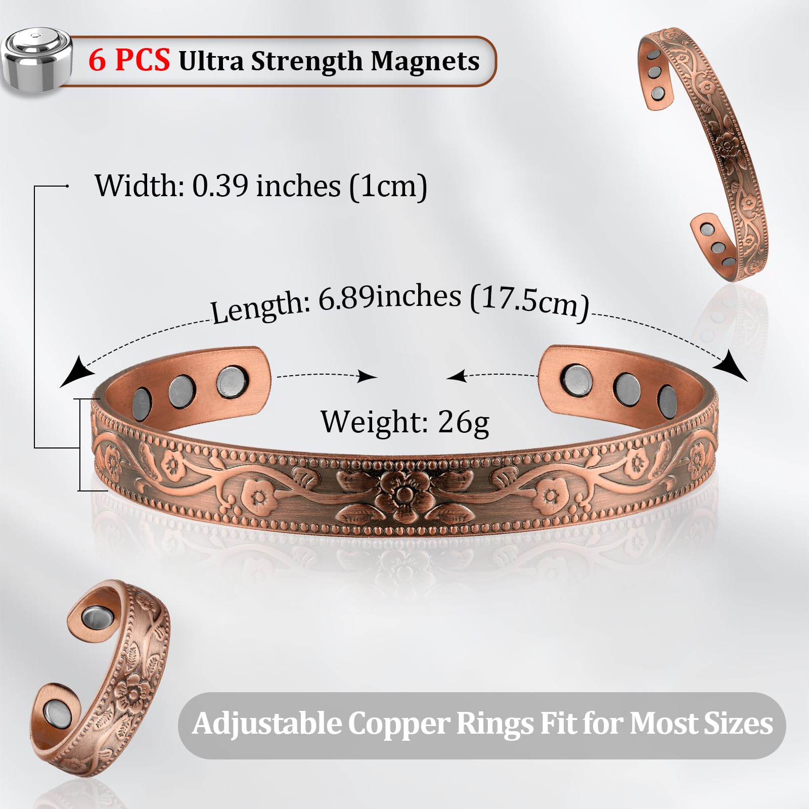 Enhanced Magnetic Strength: Our copper magnetic bracelets and rings are designed with powerful rare earth magnets, each Neodymium Magnet has a strength of 3500 Gauss. Providing comfort to your wrist and fingers, keep you energized and sleep better.