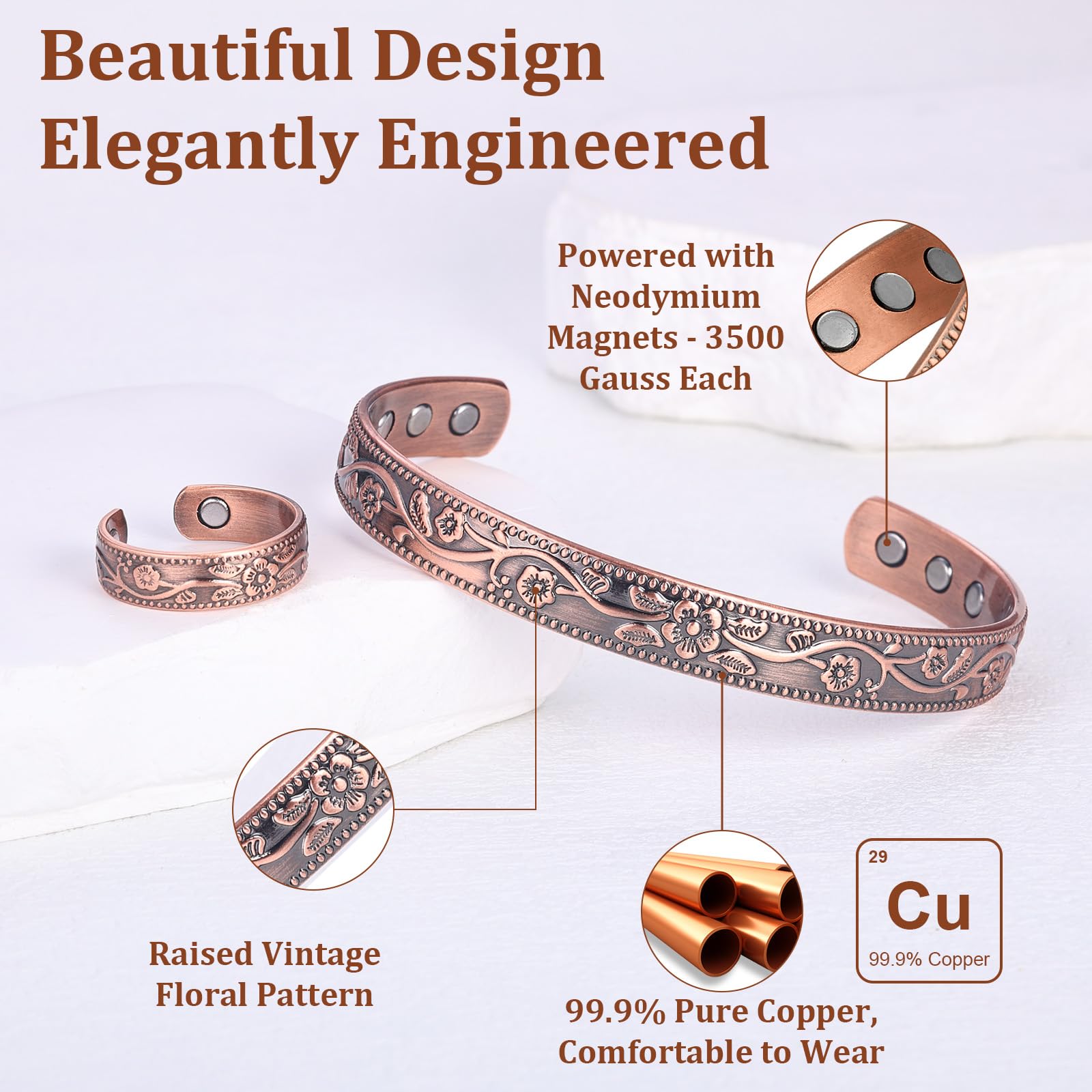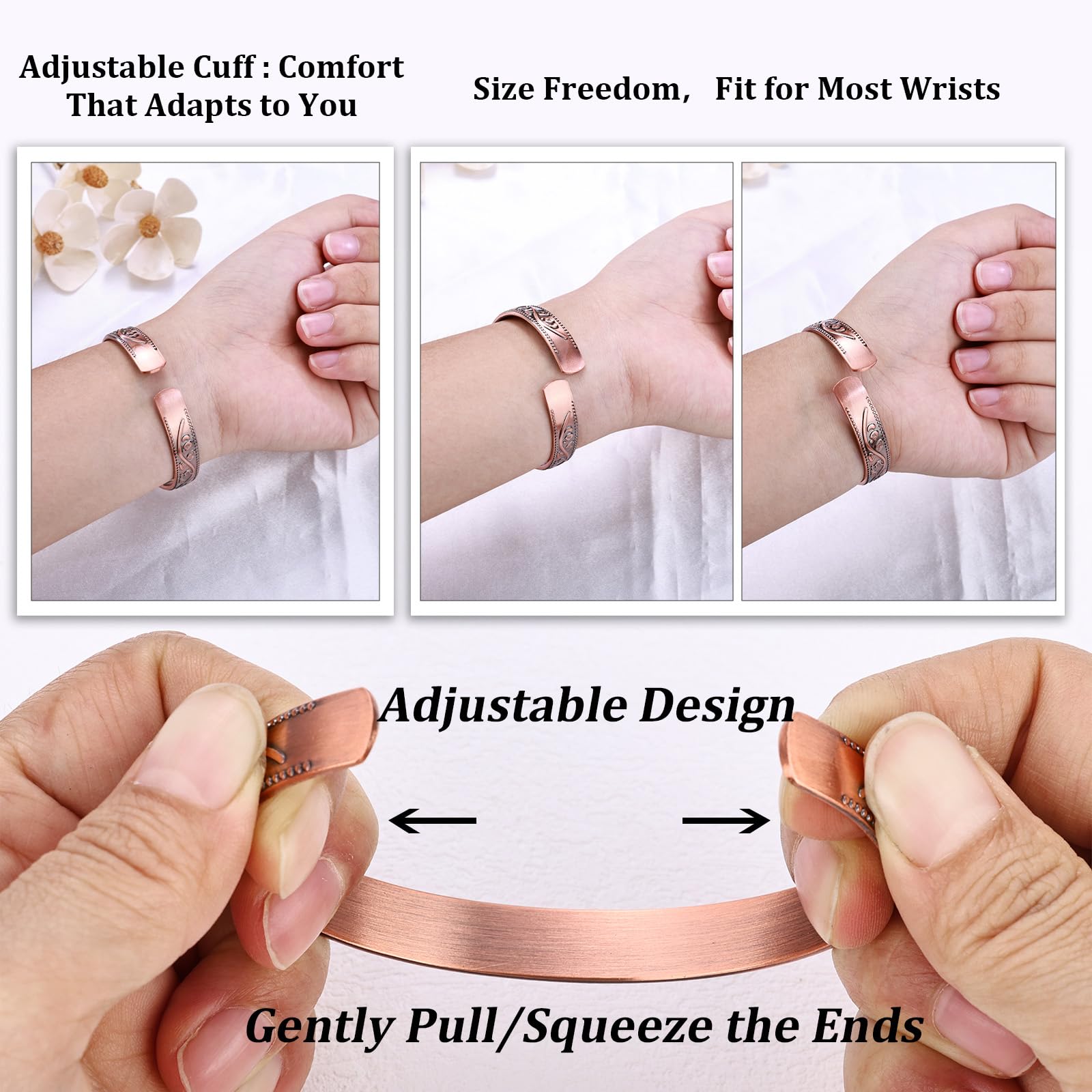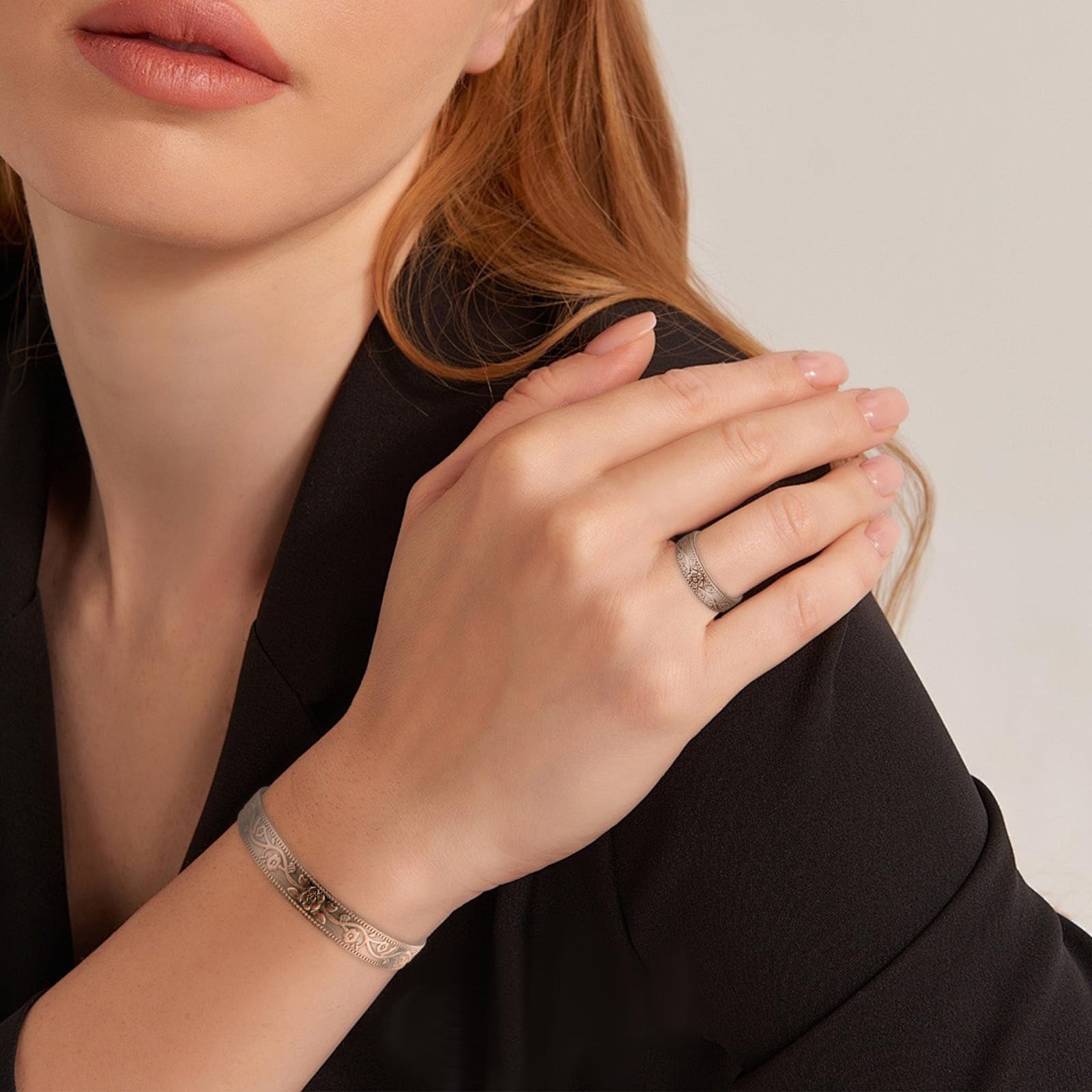 Elegant Flower Pattern: Our pure copper bracelet magnetic copper rings feature engraved flower pattern, looks beautiful and elegant. Copper gives vintage vibe that match the pattern perfectly. This copper jewelry set can pair with other jewelries in an unobtrusive way, suitable for both women and men.