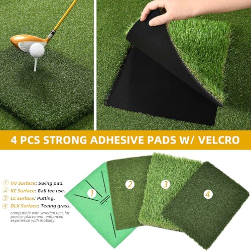 10mm high-elastic base: This 5 x 4ft golf htting mat boasts a sturdy 10mm non-slip EVA foam rubber base for stability on any surface and 4 interchangeable batting pads for practicing key swing elements at home. Includes 9 PU golf balls, 3 tees of different sizes, and 7 golf tees, suitable for all skill levels and ages