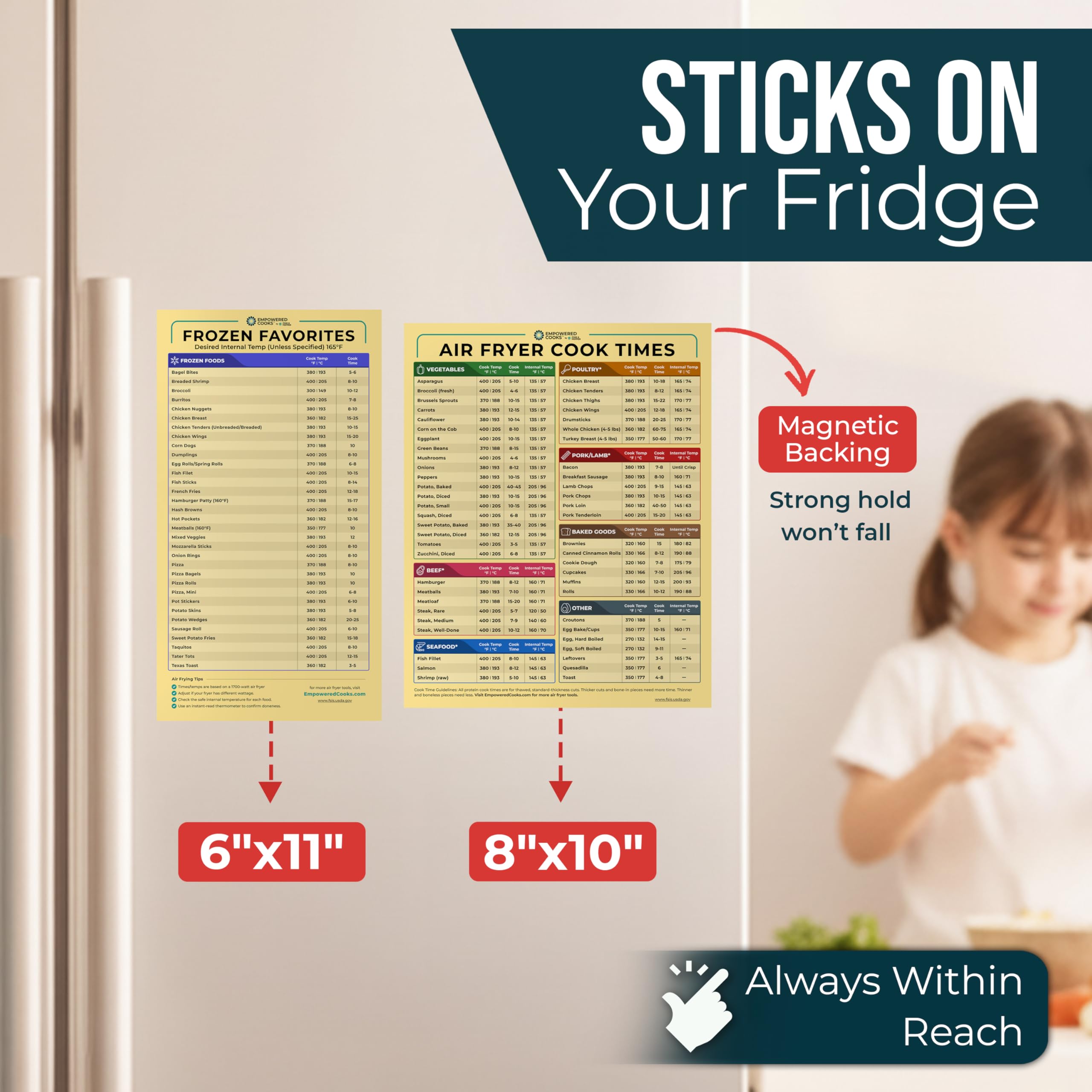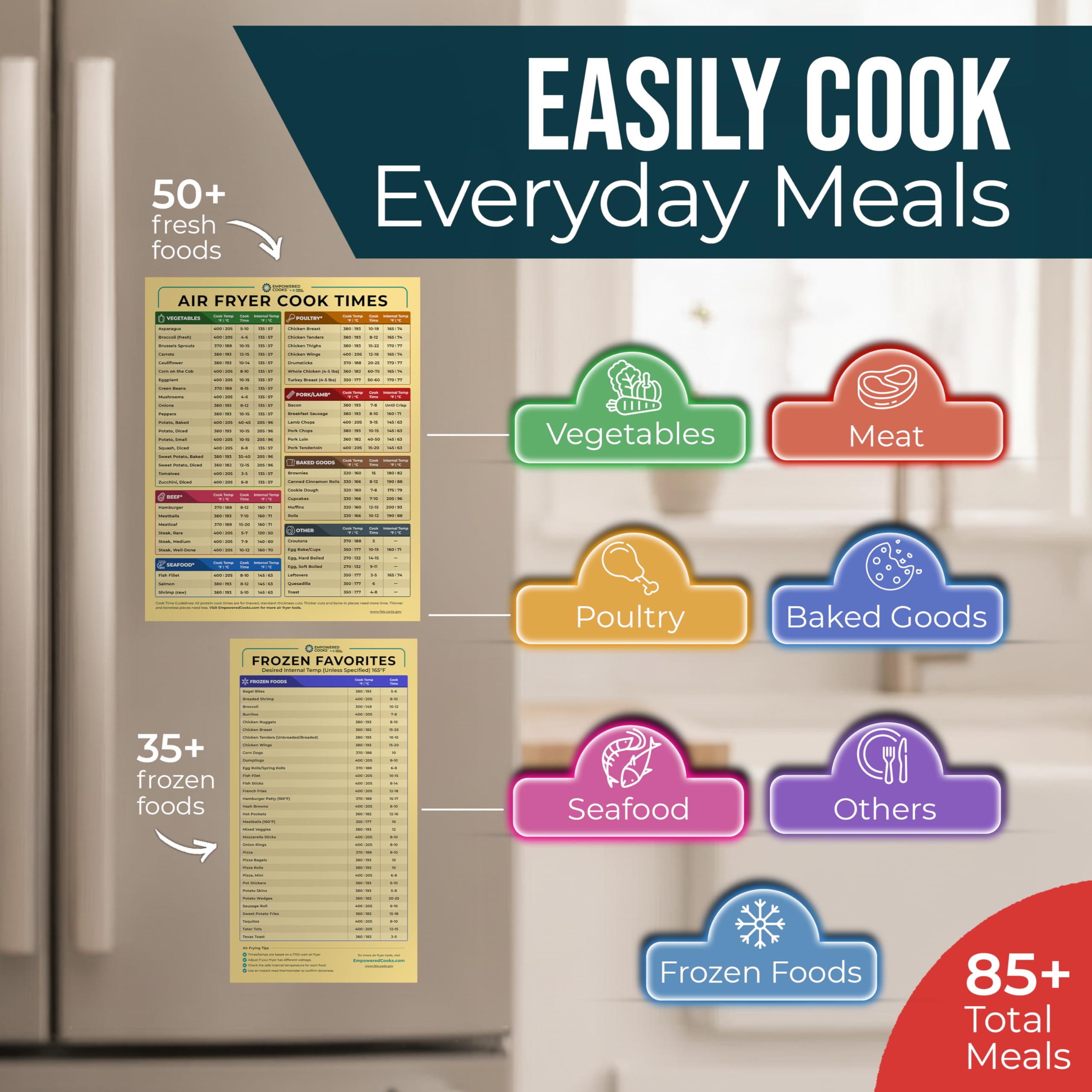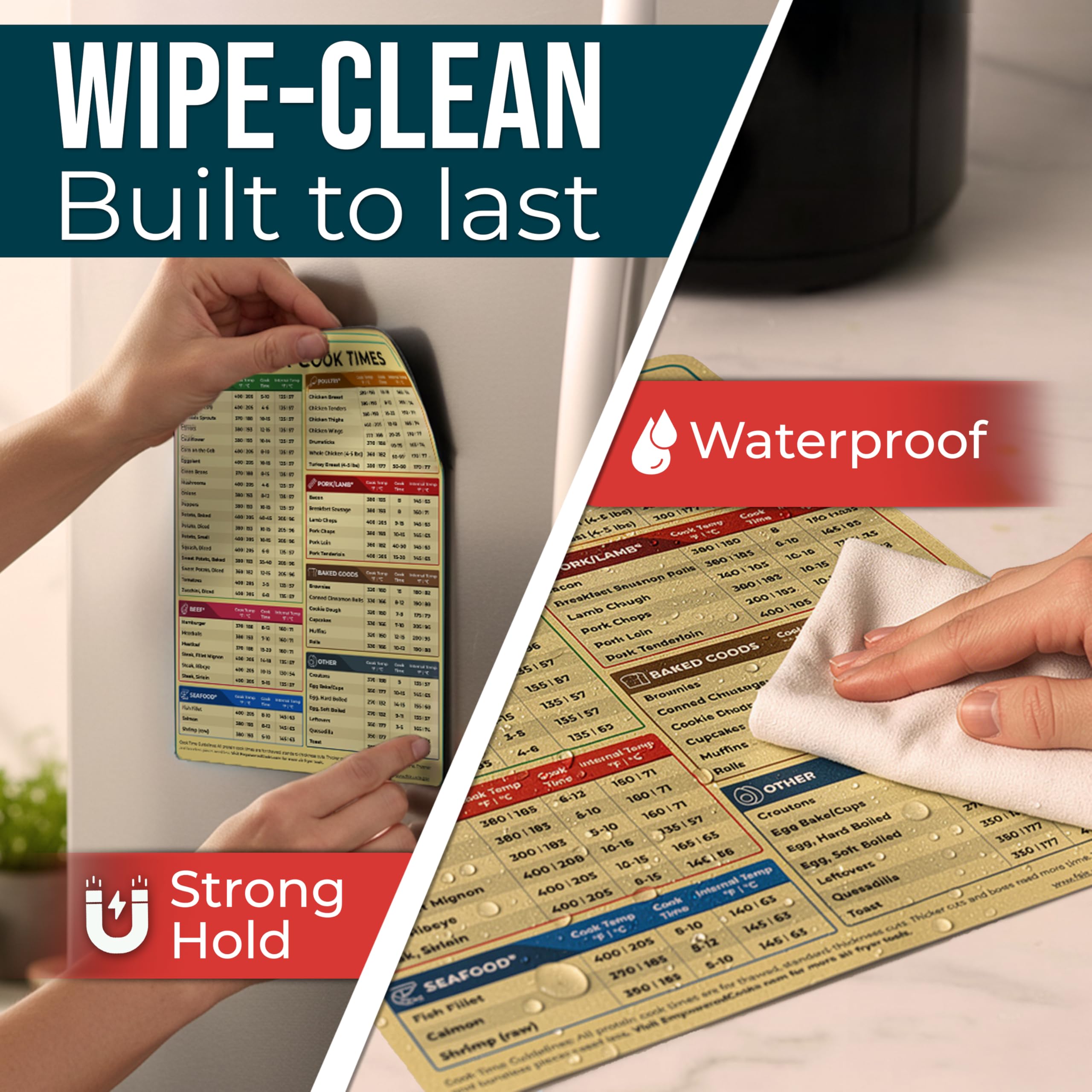 Convenient Magnetic Cheat Sheet: This air fryer cheat sheet magnet cooking guide booklet attaches securely to your fridge or other metal surfaces, providing fast access to essential cooking details. It’s a great air fryer cheat sheet that ensures you never miss key temperatures and times while cooking your favorite dishes.