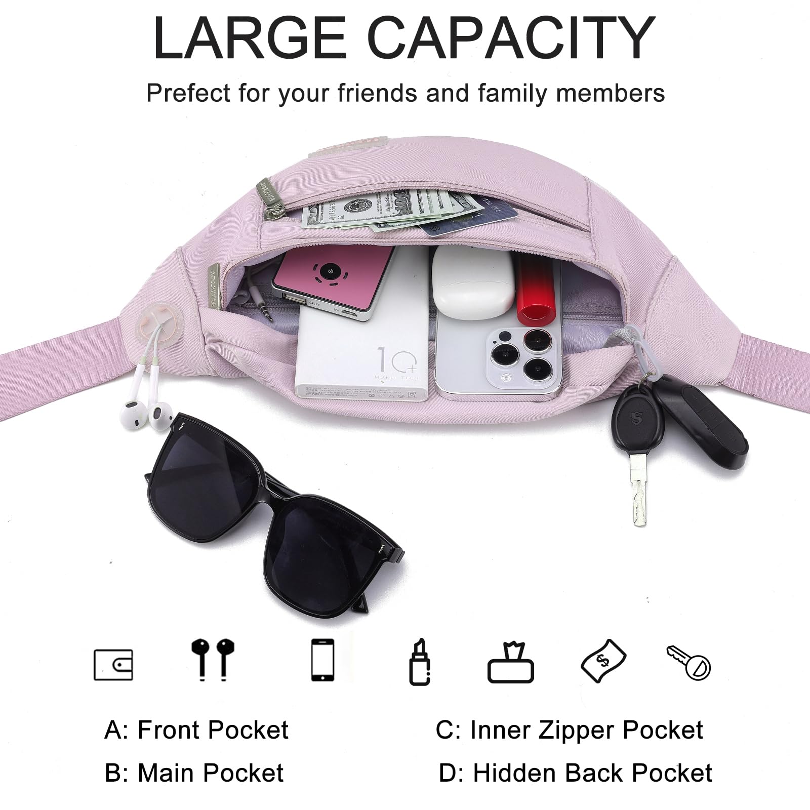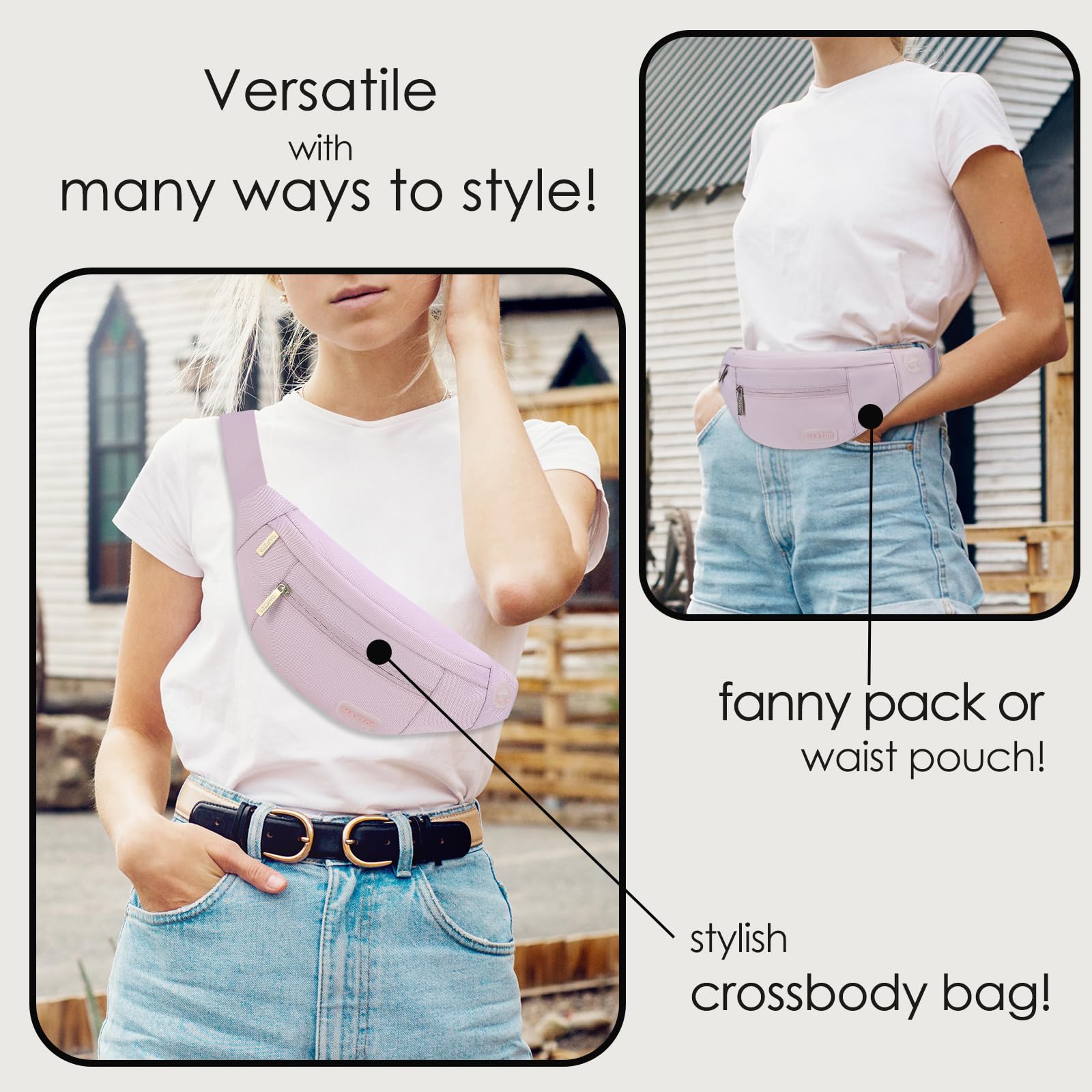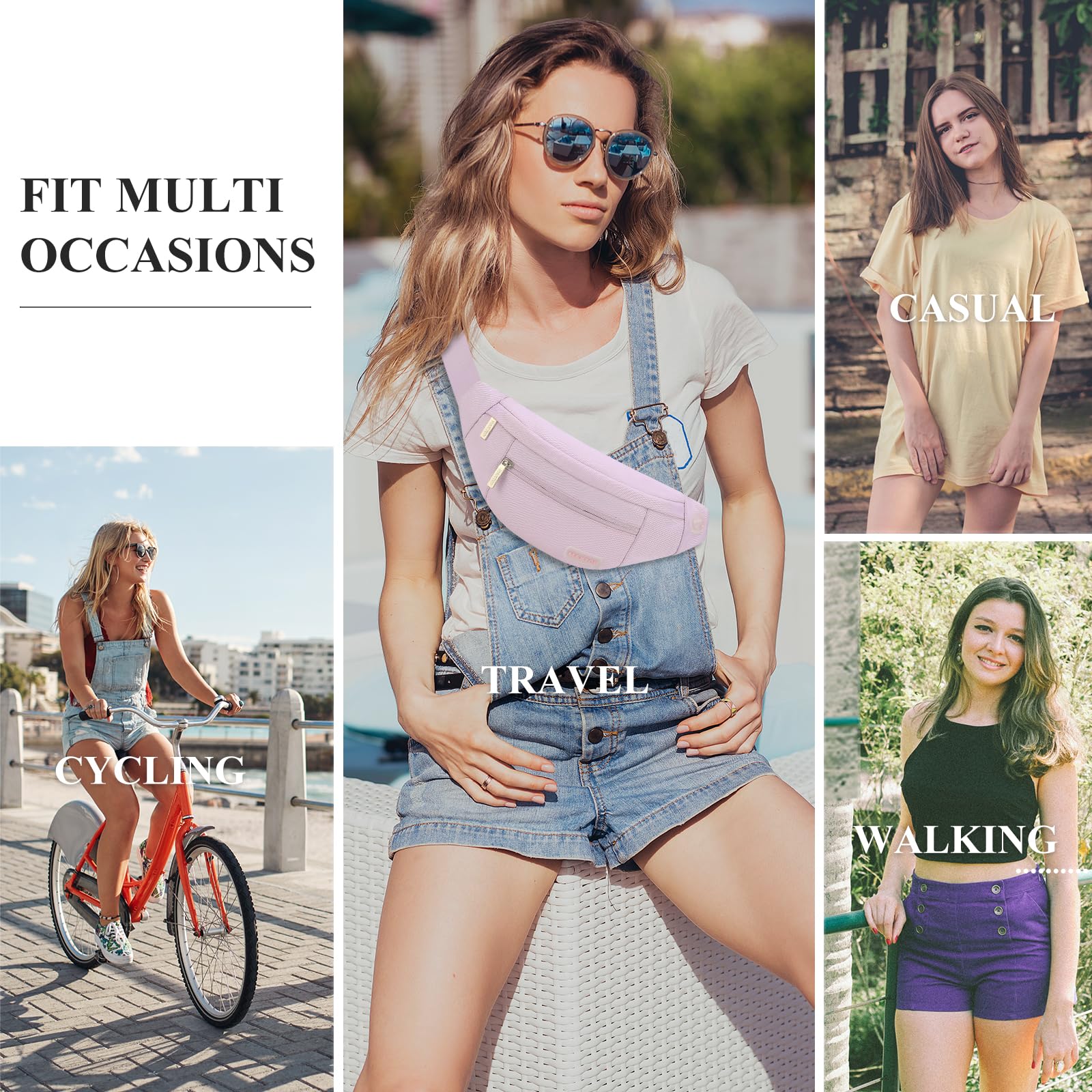 Changeable Style Fanny Pack,Many Ways to Wear — Since the comfortable long strap is widely adjustable for most waist size(20” - 50”).There are many ways to wear this fanny pack - You can wear it in front of your waist, as a belt bag,back on your hip, slant across your chest or over You shoulder.Perfect for various occasions.