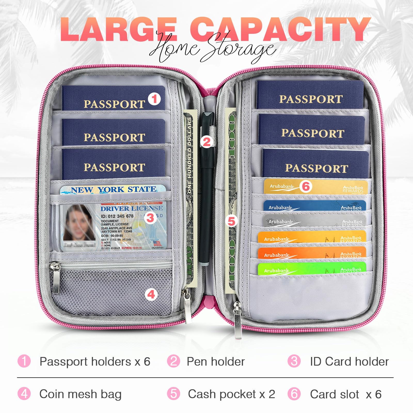 Description Introducing our versatile and stylish RFID Passport Wallet for Women - the ultimate passport wallet for women travel who value convenience and organization. Designed with the needs of large families in mind, this spacious passport holder is perfect for family vacations and group trips.Crafted from high-quality materials, our passport wallet offers durability and protection for your important travel documents. The RFID blocking technology ensures that your personal information remains secure, safeguarding against electronic pickpocketing and identity theft.With multiple compartments and pockets, this travel wallet provides ample space to store your passports, cards, cash, and other essentials. The waterproof feature adds an extra layer of protection, keeping your belongings safe from unexpected spills or rainy weather.Whether you're traveling with your partner, children, or extended family, our rfid passport sleeve use is designed to accommodate multiple passports. The zippered closure ensures that everything stays in place, while the compact size allows for easy storage in your bag or carry-on.Stay organized and stress-free during your travels with our family passport holder. It's not just a practical accessory, but also a fashionable one. The sleek design and choice of colors make it a stylish addition to any outfit.Invest in the best passport wallet for travel and experience the convenience and peace of mind it offers. Get your RFID Passport Wallet for Women today and embark on your next adventure with confidence.