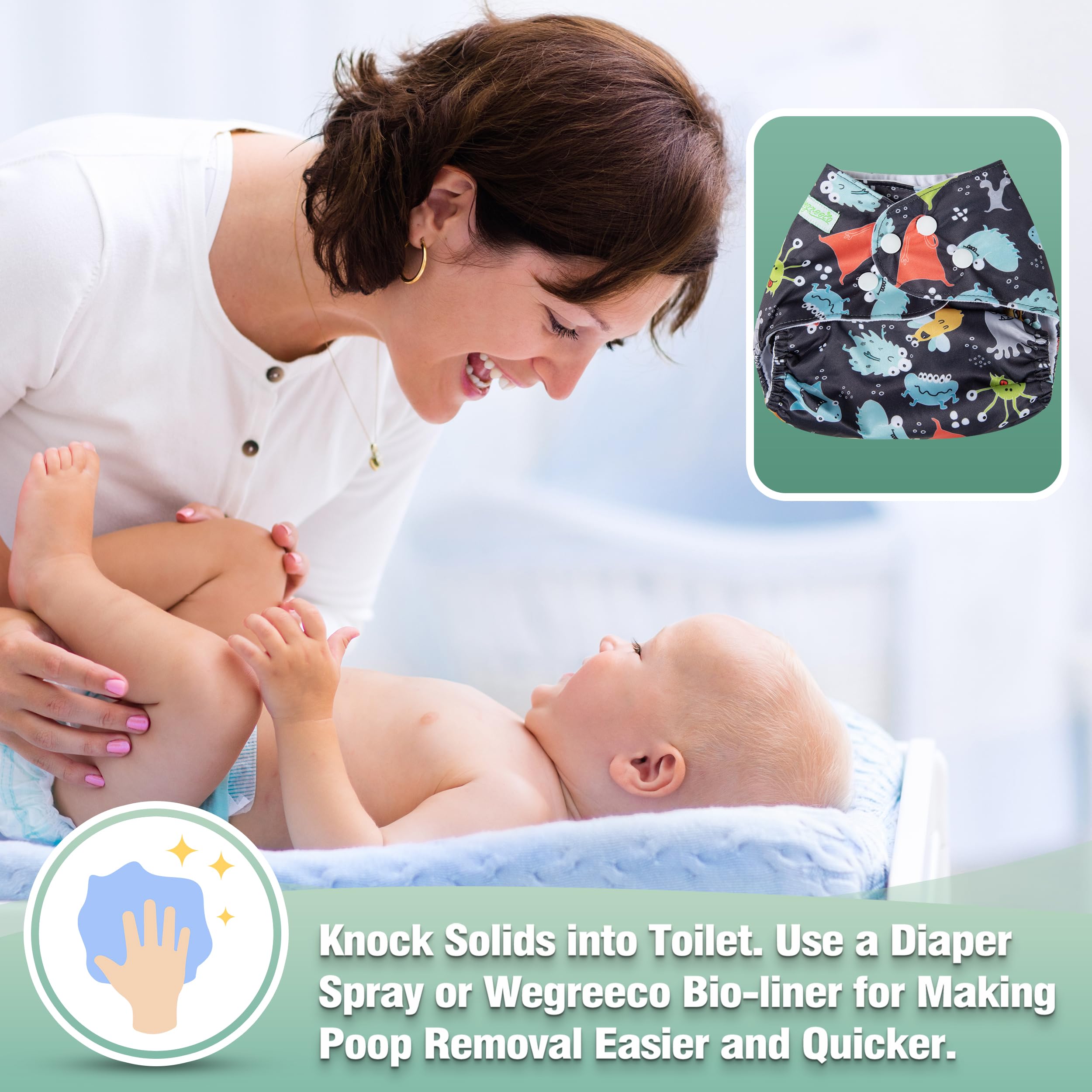 One Size Adjustable Diaper: Three rows of adjustable snaps to allow for a small, medium, large size in one diaper; Usually fit zero-two years' baby; If you are looking for a pocket diaper to last through your baby’s infancy, toddlerhood and even future babies; Wegreeco baby diapers grow with your baby