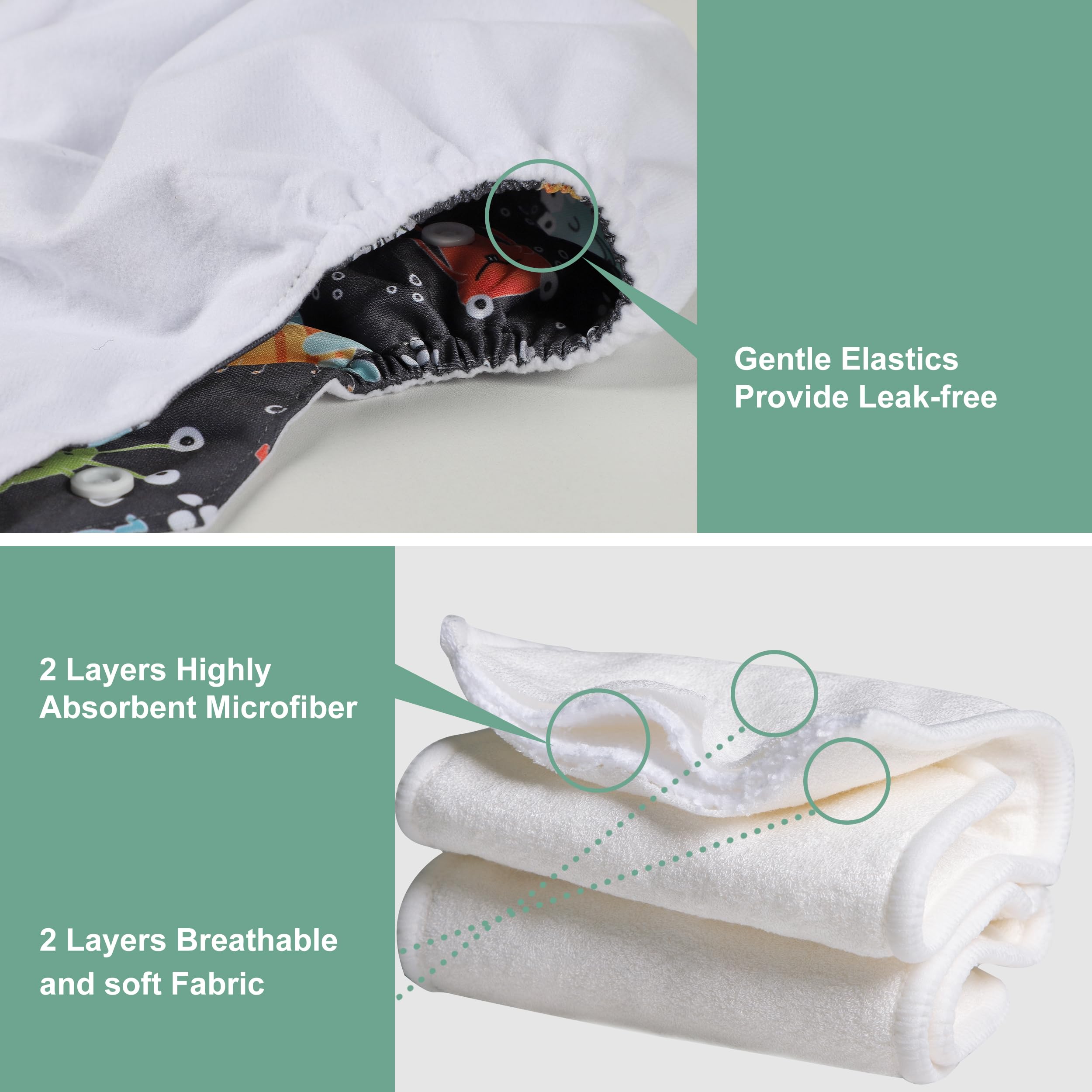 Absorbent and Soft Insert: Inserts are made of 4 layers fibre, the strong absorbent material with breathability and softness is gentle on your baby’s bottom, keep your baby comfortable and happy; The inner suede cloth touches baby, and wicks moisture away from baby's bottom to the insert