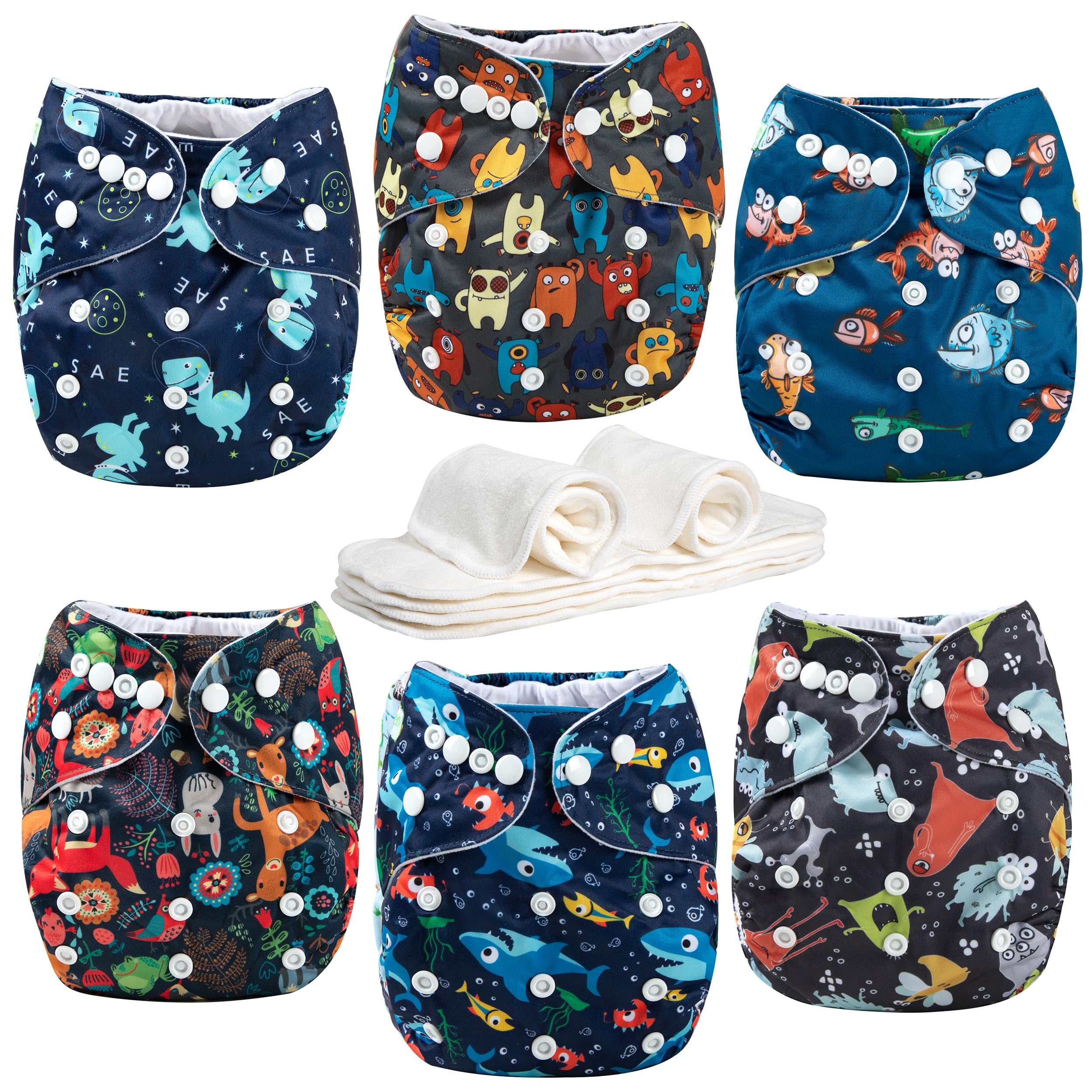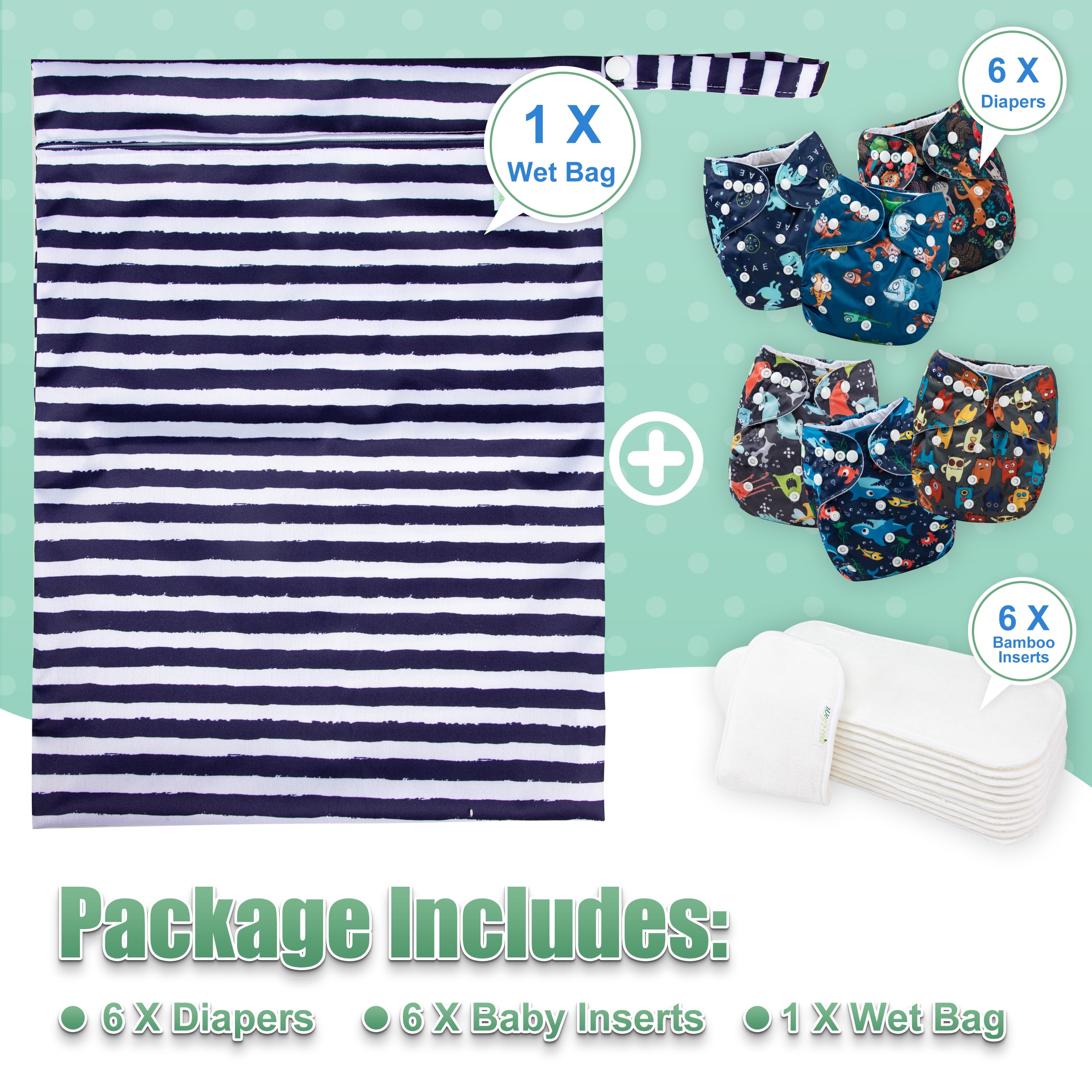 Thoughtful Package: Including 6 pack of diapers + 6 inserts + 1 wet bag per pack, 6 different modern patterns; Cute stylish prints for boys & girls; It would be ideal products for the newborns and moms