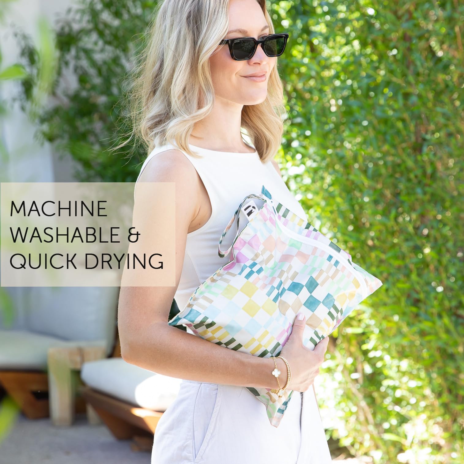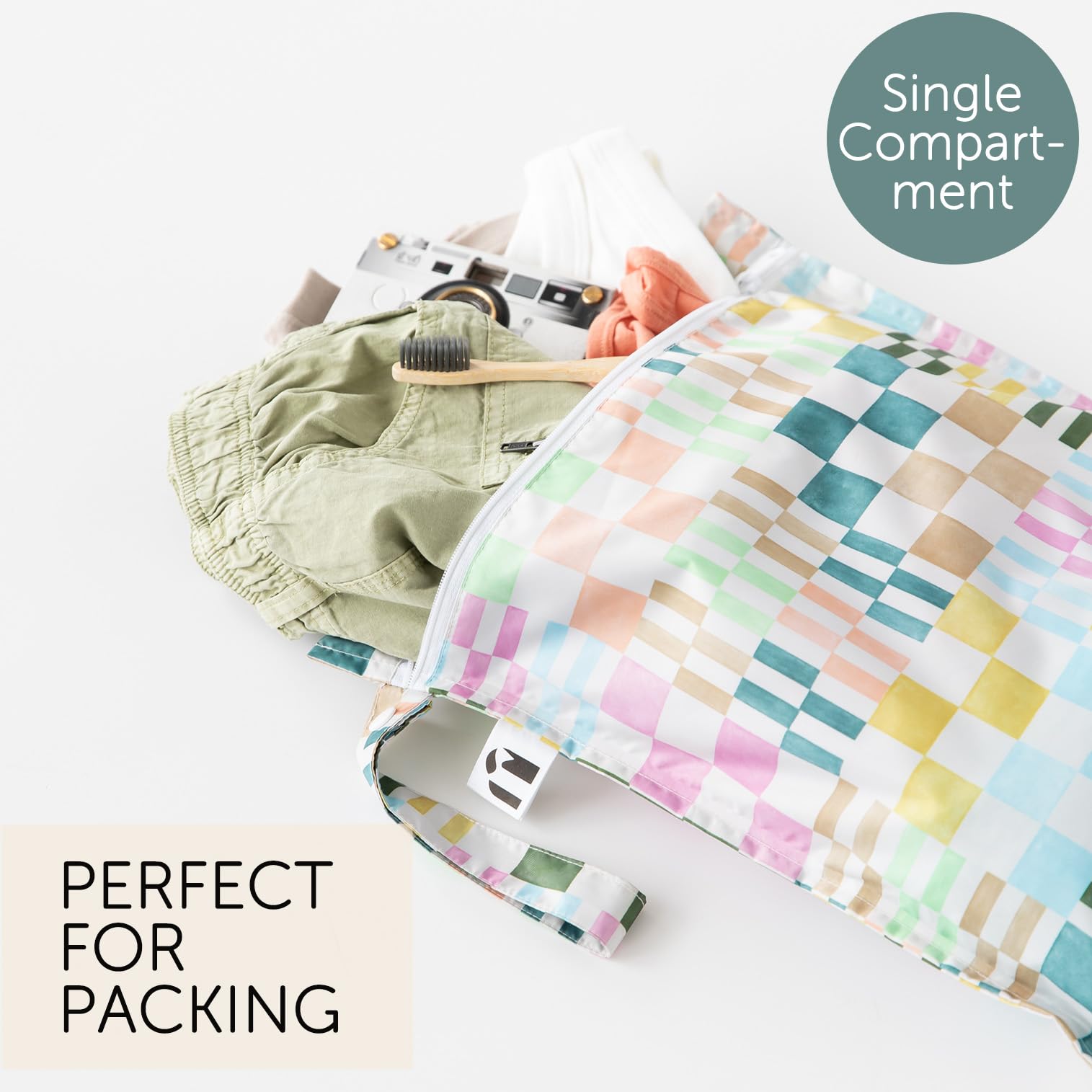 These travel bags are a smart alternative to single-use plastic bags. Featuring heat-sealed seams for true waterproof protection. Wet Bags are great for packing dirty gym clothes, a towel, damp swimsuits, diapers, and shoes. Not just for keeping wet stuff away from dry stuff–these bags make excellent organizers for extra clothes, toys, accessories, toiletries, electronics, travel and more! With a snap handle, snap your bag wherever you need it - stroller, changing table or suitcase. Even use for carrying out garbage from outings at the beach, park, picnic, pool, camping. And if you’re traveling with kids, they’re great for organizing books and coloring books, a dry change of clothes, and protecting stuffed animals. Made from Bumkins’ signature lightweight, waterproof and easy-wipe fabric. Measures 12 in x14 in (30.5 cm x 35.6 cm). Bag is single compartment, non-gusseted, non-insulated and non-stretch. Machine washable. To extend the life of the waterproof fabric, we recommend hang drying our quick-dry fabric; always ensure fabric is completely dry before storing. For over 30 years, Bumkins has been creating thoughtful and responsibly made essentials for babies and kids, making parenting easier so families can cherish those special childhood moments. Designed in Arizona, responsibly made in China.