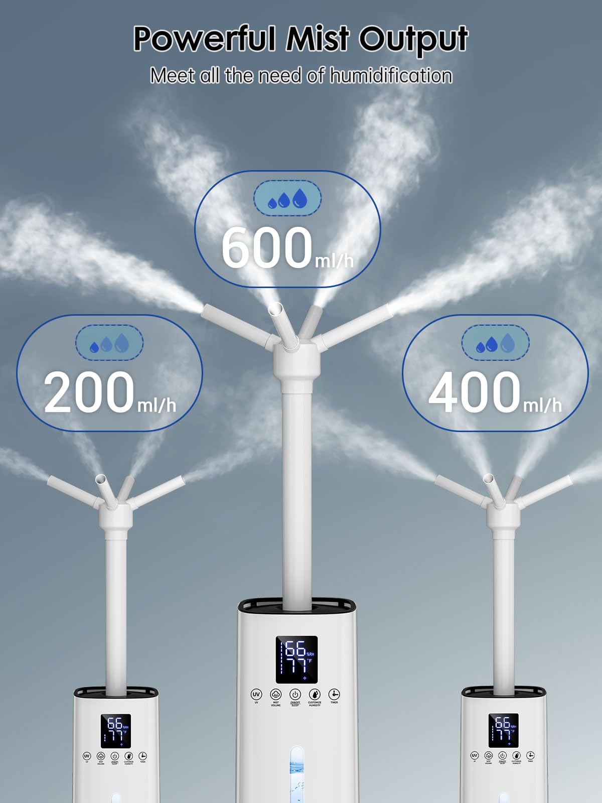 【Powerful 600mL/h Mist Output for Large Room】: With a powerful 600mL/h mist output, this humidifier large room can quickly humidify spaces up to 1200ft². Paired with an 11-inch extension tube and 4 mist nozzles, it ensures even mist distribution in every corner.