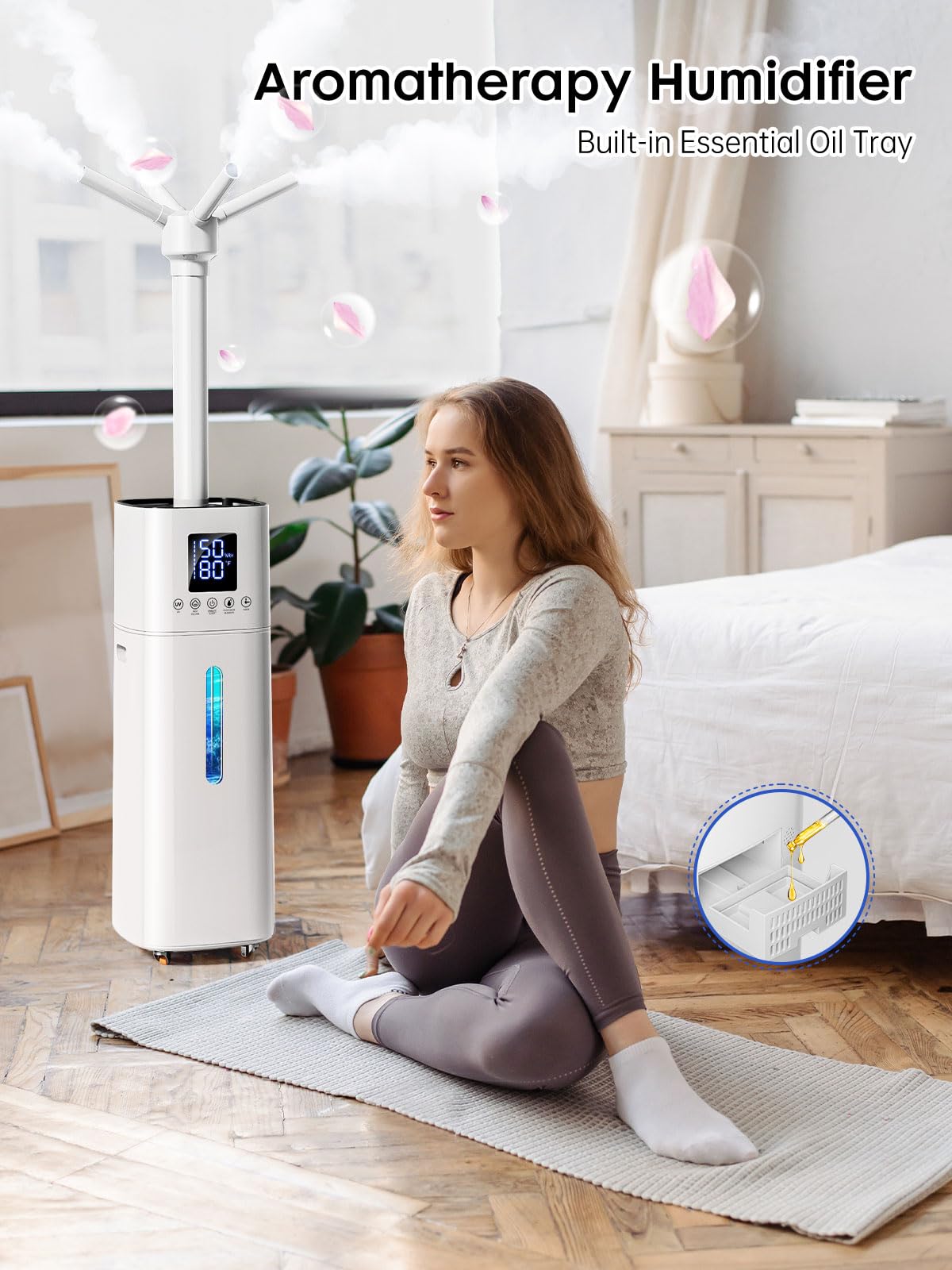 【Aromatherapy Function for Relaxation】: This humidifier features a dedicated essential oil tray for aromatherapy. Simply add 3–5 drops of your favorite essential oil to the tray. A soothing fragrance will then diffuse along with the mist, promoting relaxation and improving sleep quality.