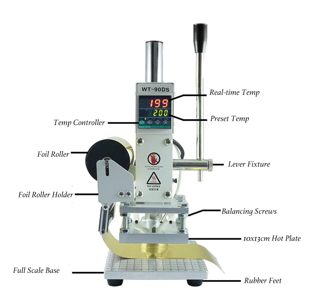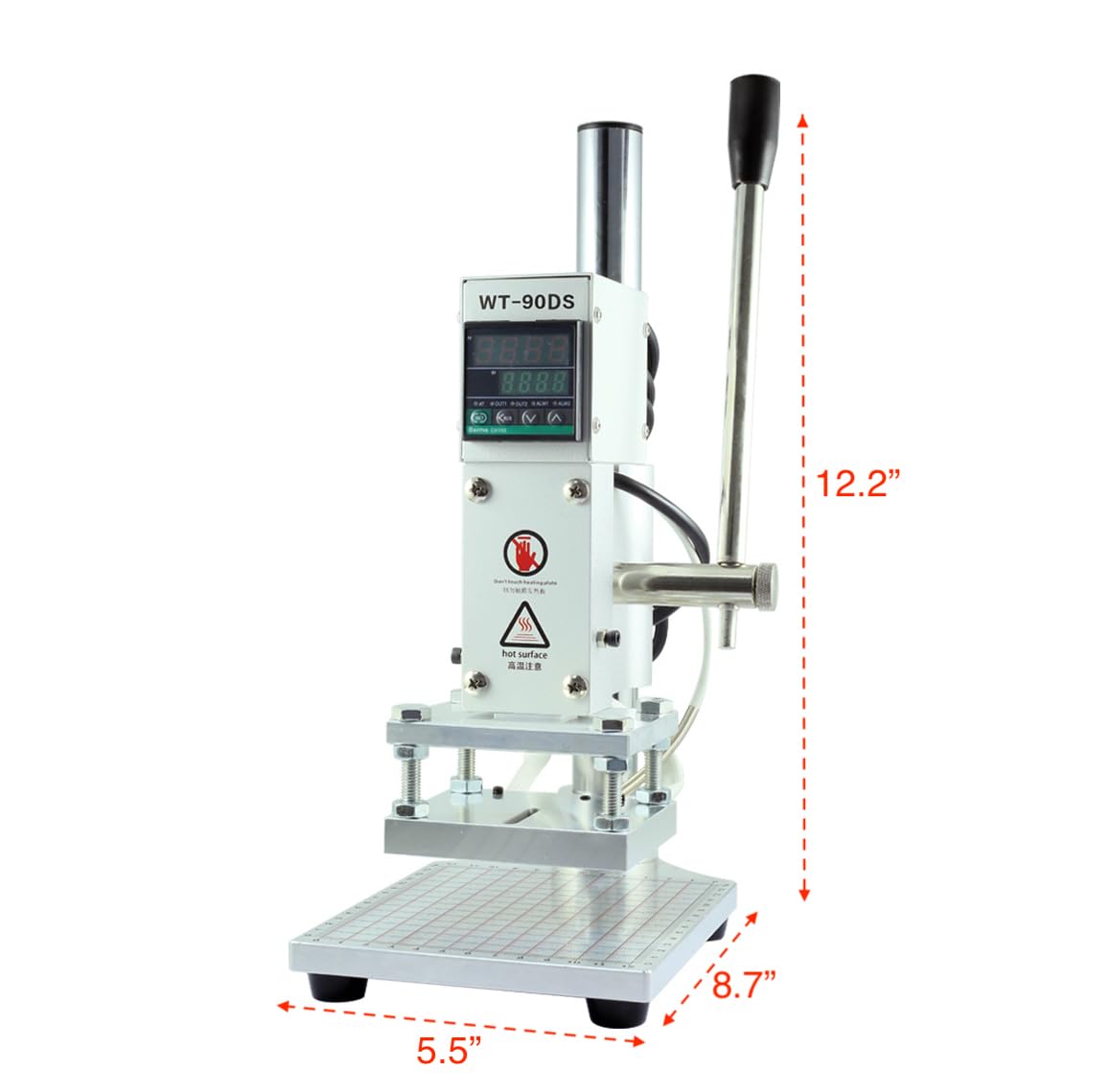 SPECIFICATION -Input Voltage: 110V -Power: 500W -Temperature: 50-350℃ -Height: 0-17cm adjustable -Stamping Area: 10x13cm -Overall Size: 8.7”x5.5”x12.2” -N.W.: 10.6 lb. PACKAGE -1 x Hot Foil Stamping Machine -1 x Test Foil -1 x Fuse -1 x Set of Tools