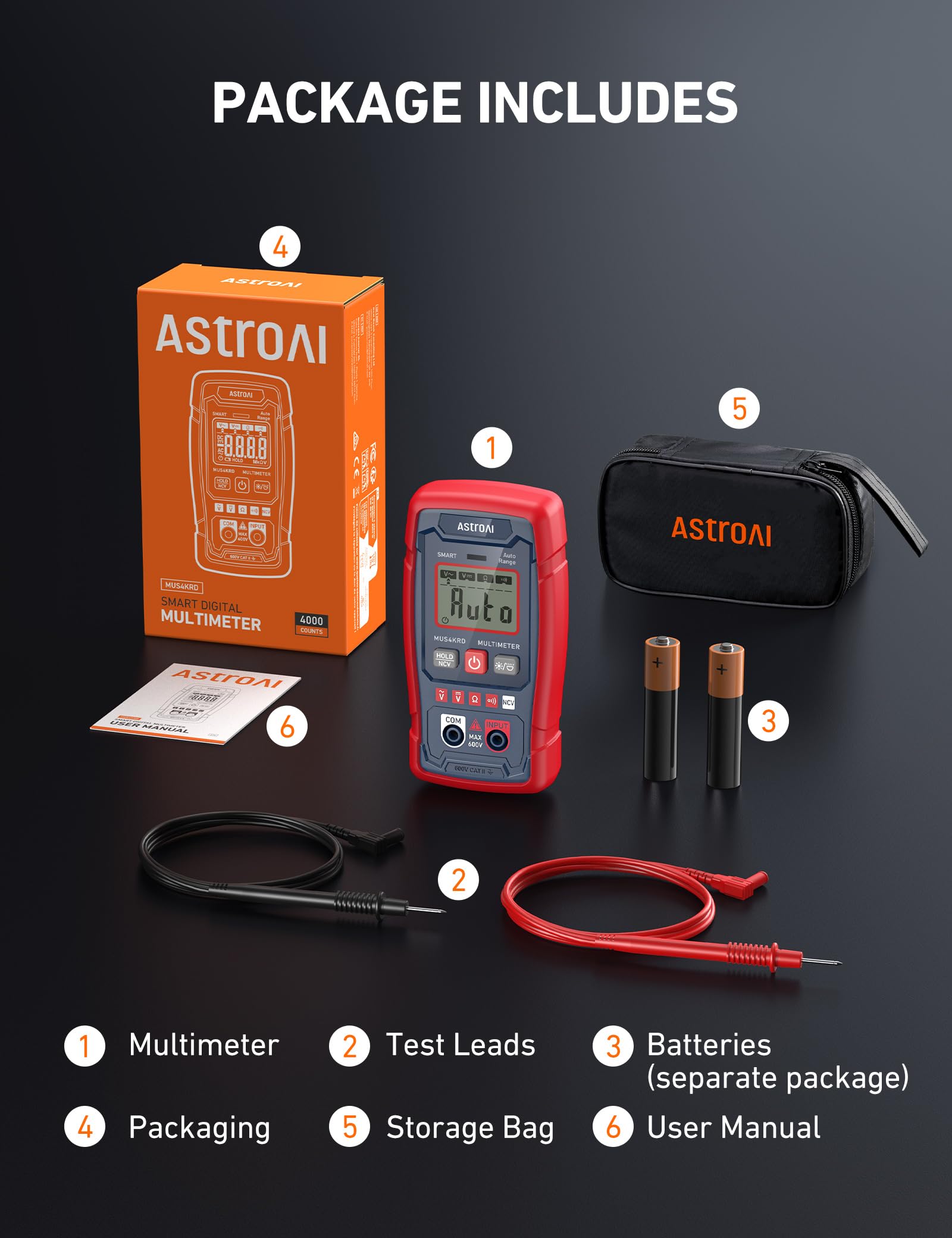 Package Includes - A Multimeter, 2*1.5V AAA batteries, test leads, a storage bag, and a user manual. This multimeter is designed for taking easy-to-use measurements and hassle-free troubleshooting.