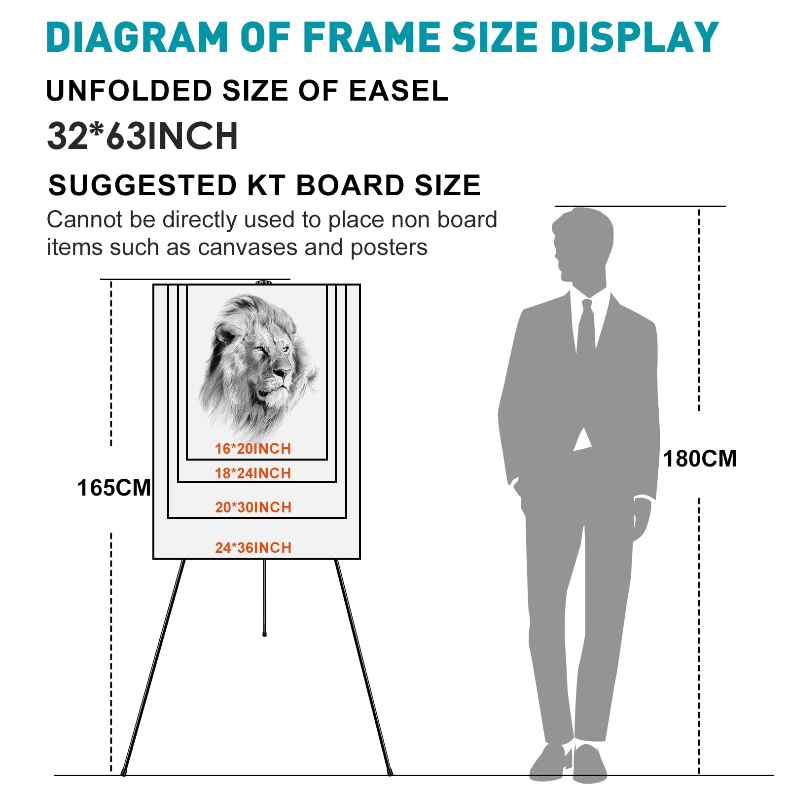 【Important TIP】: The Easel is a collapsible lightweight easel that weighs 2 pounds and stands 63in tall, portable and easy to set up for foam boards and lightweight signs weighing less than 5 pounds, not suitable for outdoor use in windy weather.Under the condition of no deformation, pull the three support feet outward to the farthest, which will be more stable.