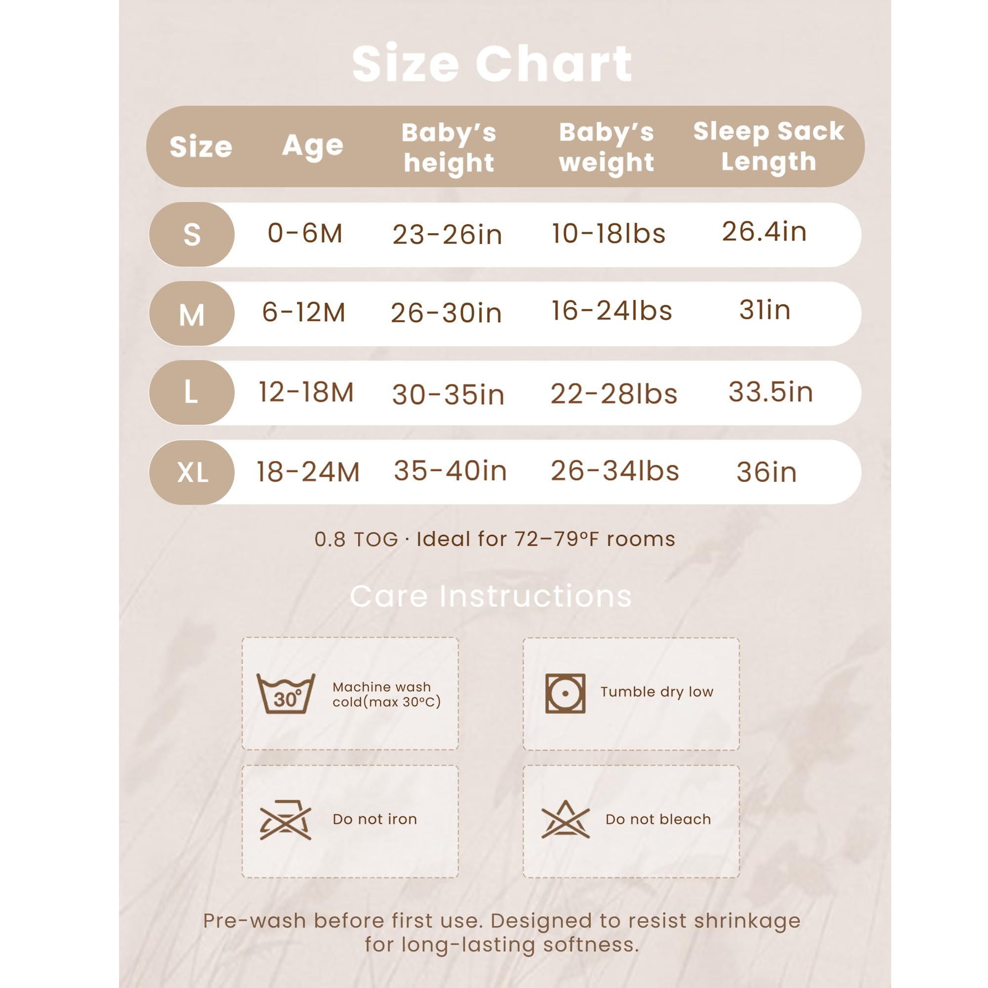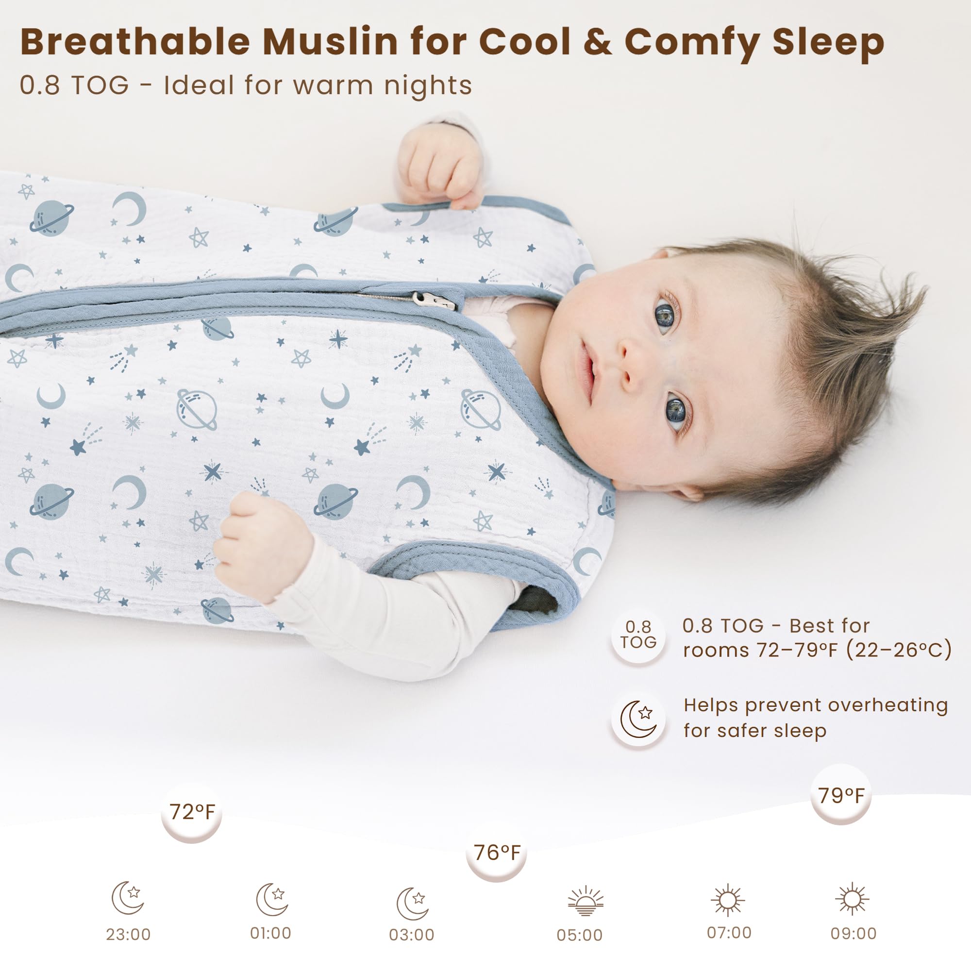 0.7 TOG for Gentle Temperature Regulation: Designed with a 0.7 TOG rating, this muslin sleep sack provides just the right amount of lightweight warmth for babies who tend to run warm. It helps maintain a steady, cozy temperature without overheating—perfect for spring, summer, and air-conditioned rooms.
