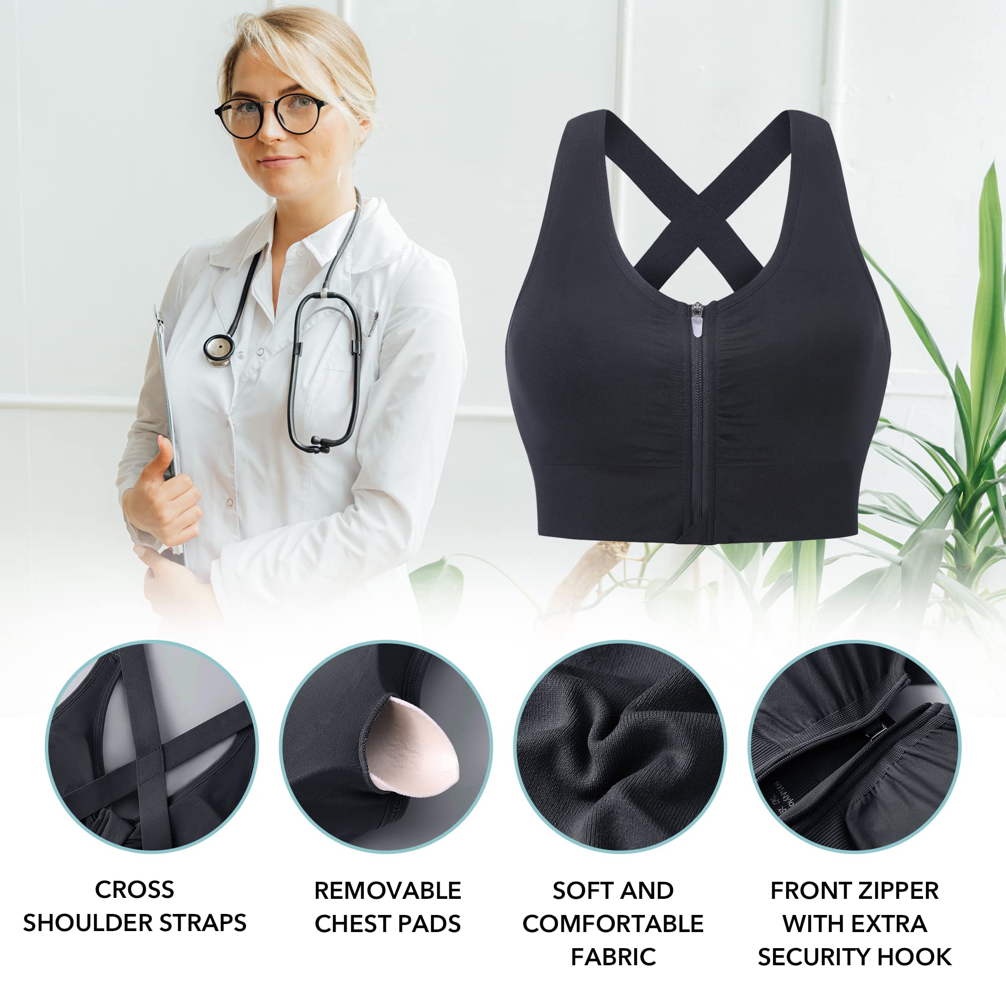 SKIN-FRIENDLY FABRIC: This front zipper sports bra is made of high-elastic seamless fabric (90% nylon, 10% spandex), which is soft, sweat-wicking, and can be 4-way stretch, providing good coverage to keep you cool and comfortable. It won't irritate your skin or incision and helps reduce swelling, relieve pain, and speed up the healing process. Wide cross straps on the back of the sports bra, popular and breathable,it also provides the right amount support to help you regain your healthy body.