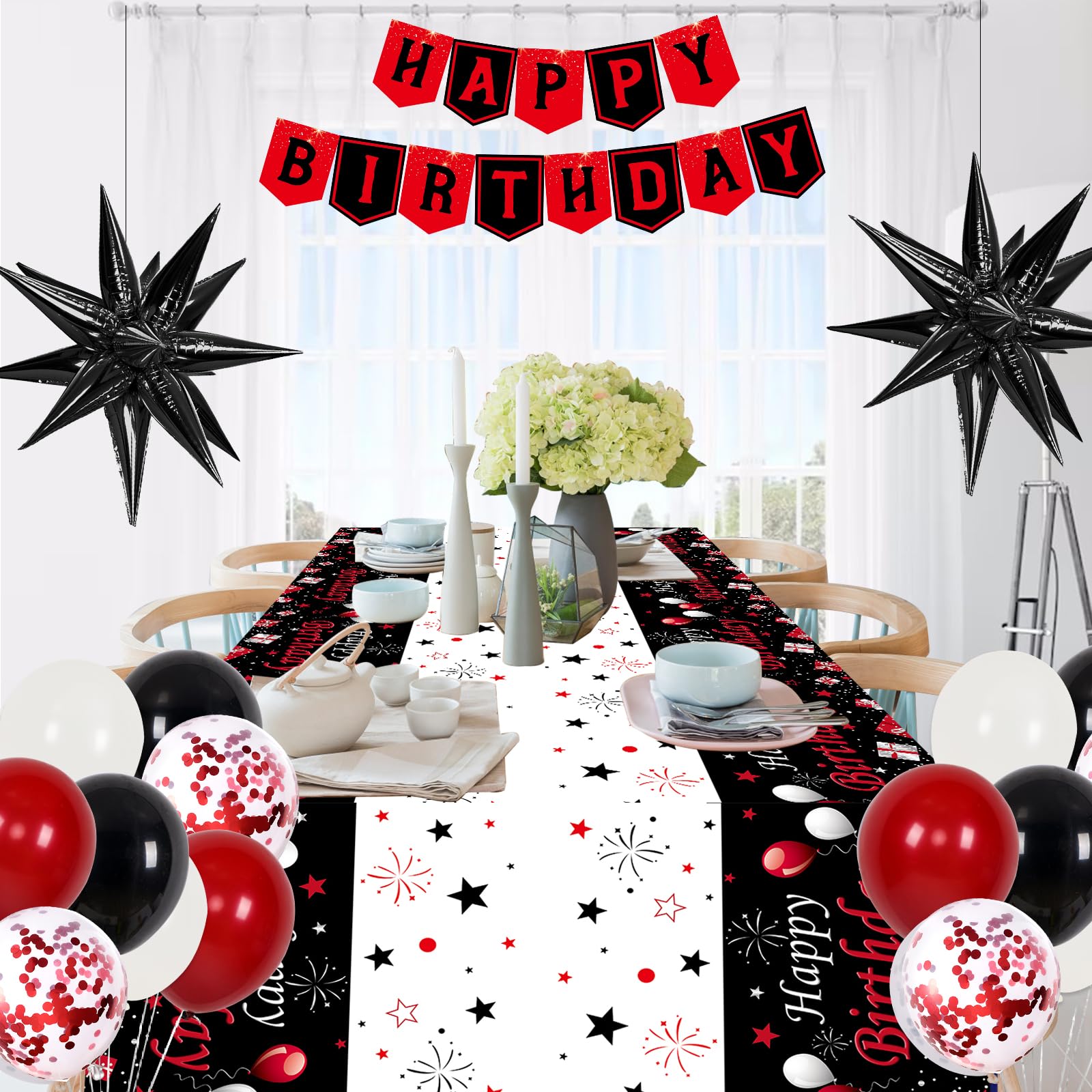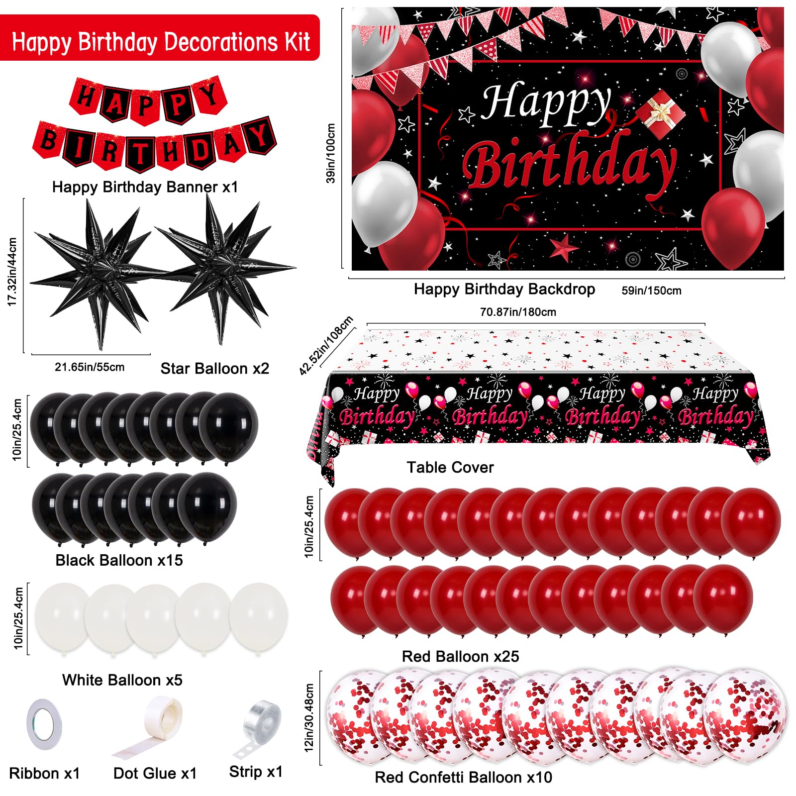 Red and Black Birthday Decorations Kit --- Includes 10" latex balloon 45pcs ( red balloons 25pcs, black balloons 15pcs, white balloons 5pcs ), 12" red confetti balloons 10pcs, happy birthday backdrop cloth 59.1 x 39.4in (150x100cm), happy birthday banner 1 set, happy birthday table cover 1pcs, black star foil balloons 2pcs, sticky dots, strip and ribbon.