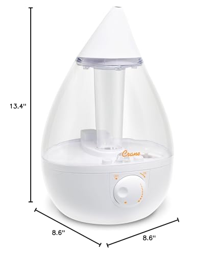 Crane White Teardrop Ultrasonic Cool Mist Humidifier, 1 Gallon Auto Shut-Off for Large Room, Baby Nursery, Bedroom Office, Clear & White