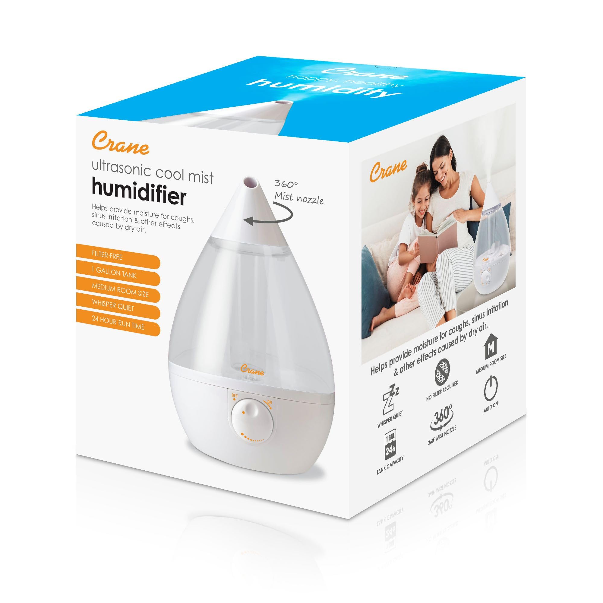 Premier Quality You Can Trust! Crane humidifiers are designed to promote better sleep, ease congestion, and support overall health and wellness throughout every seasonal change. Utilizing ultrasonic noise canceling technology, Crane's whisper-quiet humidifiers are perfect for any indoor space. Breathe easier throughout the night or keep your little one more comfortable in their nursery with our line of humidifiers for babies that are quiet, adjustable, and feature soft-glowing nightlights to ease them to sleep. You can even find on-the-go allergy and cold symptom relief with our travel-sized car humidifier that’s made for portability. Whether you're looking for a cold or warm mist humidifier, an evaporative humidifier, a personal humidifier, or even a humidifier for plants, we've got you covered with a wide range of bottom fill and top fill humidifiers. Discover our selection of humidifiers for large rooms, humidifiers for small rooms, and humidifier accessories today.