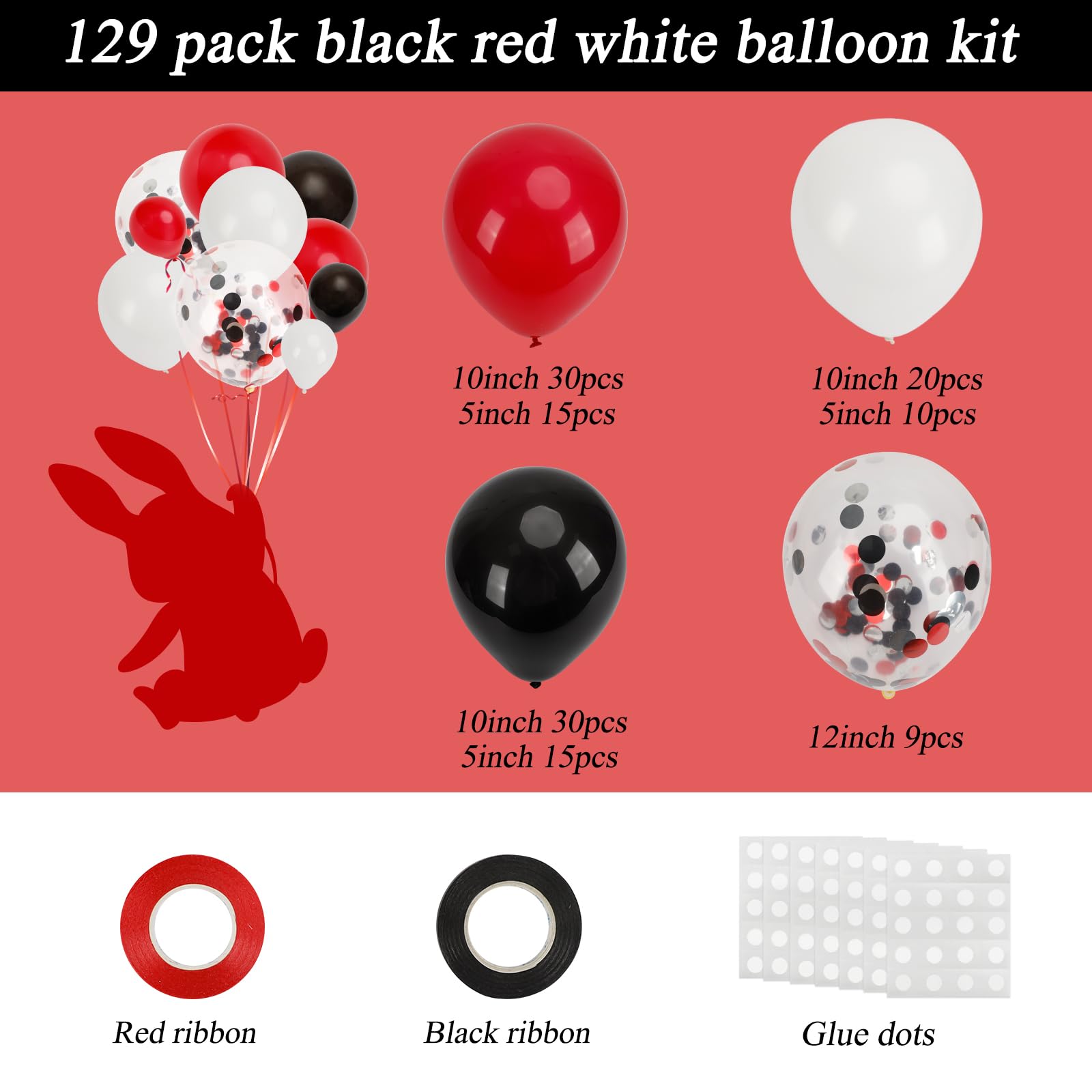 【Package Include】 Our kit includes 130pcs balloons in 4 colors, and we also give you 5 kinds of accessories: black ribbon, red ribbon, dot glue, decorative strip which can better help you to build the balloon arch.