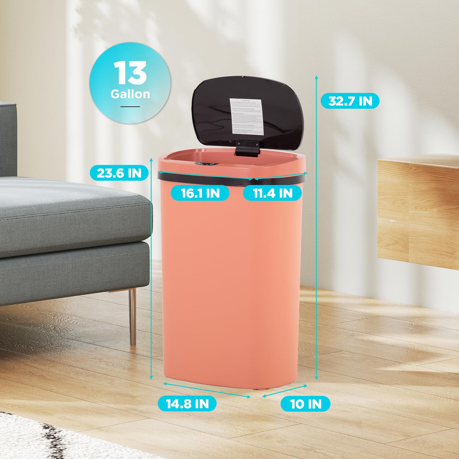 Touchless Convenience: Experience the ultimate in hygiene with our Automatic Motion Sensor Bathroom Trash Can. Easily open the 13 Gallon Touchless Trash Bin using knee or hand gestures, eliminating contact and maintaining cleanliness in your home.