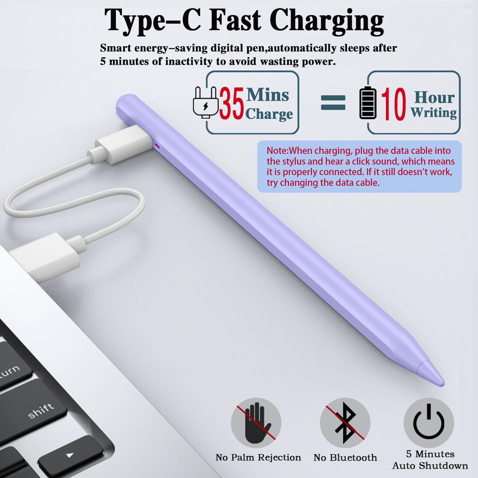 【Smart Touch Switch & Power Save】-The touch screen pen stylus is easy to use: just double-tap the top of the android tablet stylus pen . Unlike other stylus for iphone , there's no need for drivers or bluetooth settings. This iphone pen uses the popular USB-C charging port,which allows better connection to a computer or adapter for charging.Just 35 minutes of charging will give you 8-10 hours of operation.Our digital pen has smart energy-saving feature, automatically turn to "sleep mode" after 5 minutes of inactivity and avoid unnecessary battery consumption.