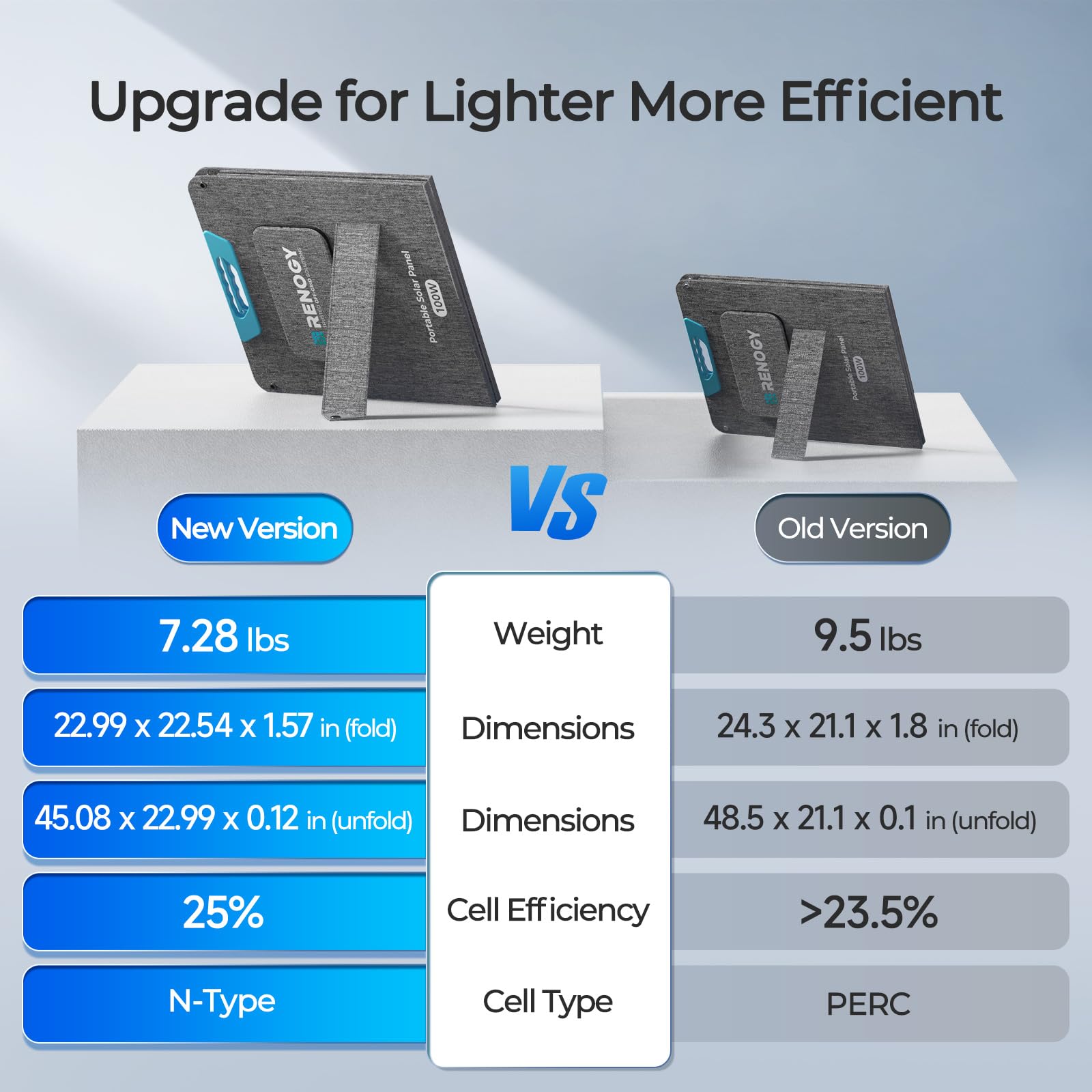 [Industry-Leading Efficiency 25%] Upgraded with 16BB N-Type cell technology, Renogy solar panels for camping achieve 25% efficiency—outperforming standard 9BB 100W portable solar panel (22.5%). This means more power from the same sunlight, ideal for limited spaces or cloudy conditions. Whether charging batteries/power stations or running appliances, you get faster energy generation and higher daily output with this foldable solar panel.