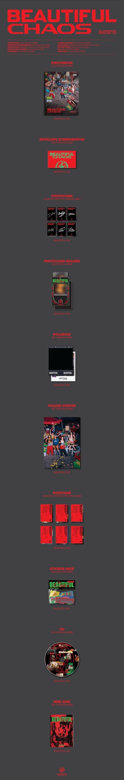 Photobook Cover: 1 per version / W246 x H316 mm Photobook: 1 per version / W246 x H316 mm Component Envelope: 1 per version / W230 x H140 mm Photocard: Random 1 out of 6 per version / W55 x H85 mm Polaroid: 1 per version / W88 x H107 mm Postcard: Random 1 out of 6 per version / W150 x H100 mm Poster: 1 per version / W297 x H420 mm Sticker Pack: 1 per version / W145 x H100 mm Mini Book (Booklet): 1 per version / W190 x H250 mm Photocard Holder: 1 per version / W72 x H118 mm CD-R: 1 per version / W120 x H120 mm