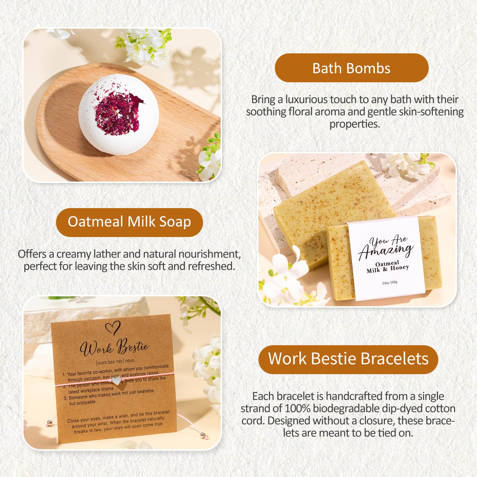 FUN & RELATABLE TREATS INSIDE – From the moment she opens this box, your work bestie will feel seen. It includes a 16oz drinking cup with lid, straw and brush that proudly defines “WORK BESTIE” as your favorite coworker-turned-therapist. Pair that with a rose bath bomb, a lavender candle that says “THANK YOU FOR BEING MY UNPAID THERAPIST”, a handmade oatmeal honey soap that reads “You Are Amazing”, and a wish bracelet to remind her how special she is.